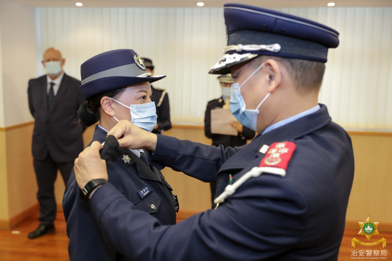 儀式簡單而莊重,出席的領導和各部門主管為獲晉升警長戴上新肩章,吳錦華局長表達祝賀並勉勵他們在職涯的新階段,尤其面對目前嚴峻的抗疫形勢,要發揮警隊中堅力量的作用,帶領前線人員團結一致,以主動的態度、創新的精神、積極的步伐,不斷提升自身能力和專業水平,以應對社會的新挑戰,為保障澳門社會的穩定和廣大市民的安全積極作出貢獻!