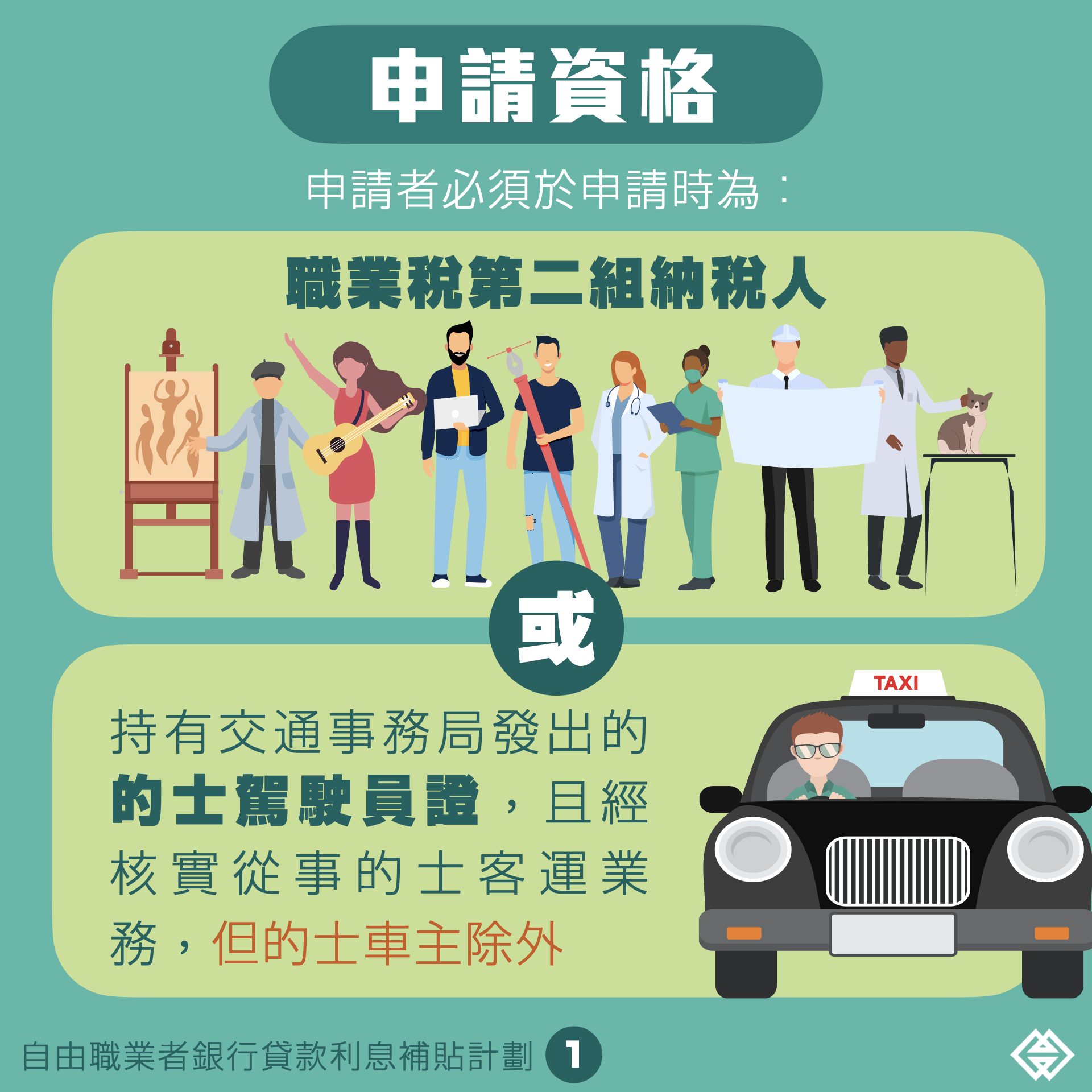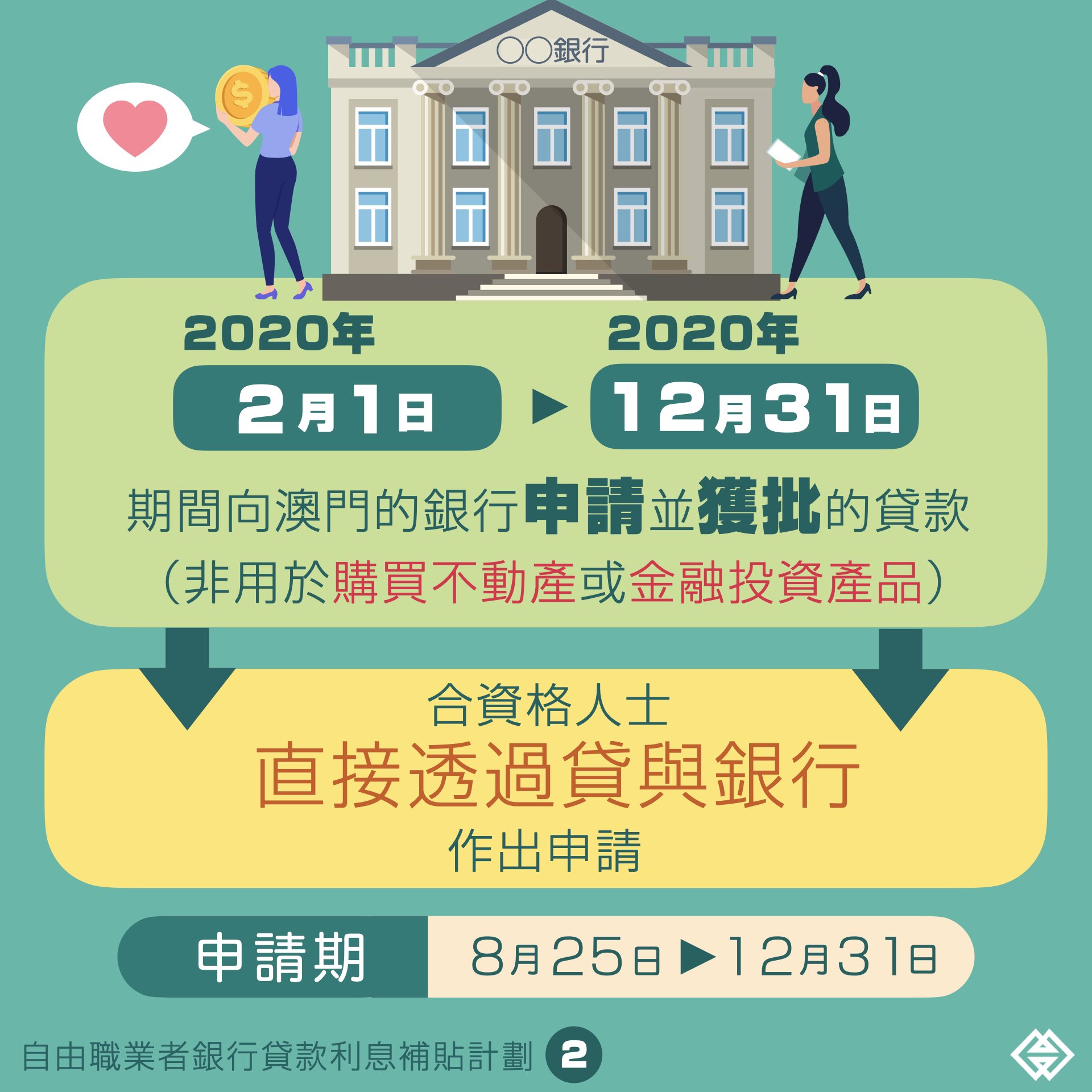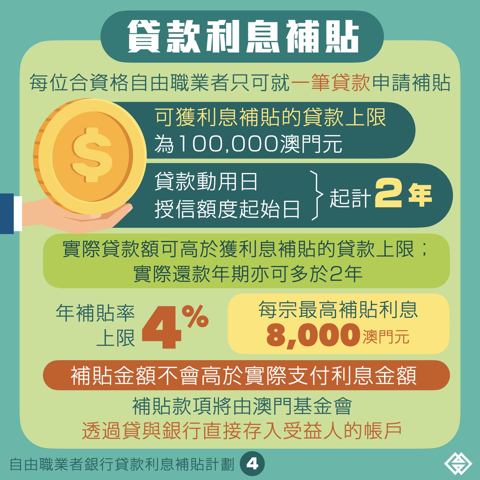 為協助自由職業者應對疫情衝擊,緩解財務壓力,特區政府於8月25日推出“自由職業者銀行貸款利息補貼計劃”。根據相關行政法規訂定,未有拖欠特區政府債務的澳門居民,於2020年2月1日至12月31日期間向澳門銀行申請並獲批的貸款,可透過貸與銀行向澳門金融管理局申請利息補貼。申請者必須於申請時,為已登記職業稅第二組納稅人,或持有交通事務局所發出的士駕駛員證且經核實從事的士客運業務;申請者只可就一筆貸款申請利息補貼,利息補貼率上限為四個百分點,補貼金額不可超過申請者實際支付的利息金額,即每宗最高補貼8,000澳門元。