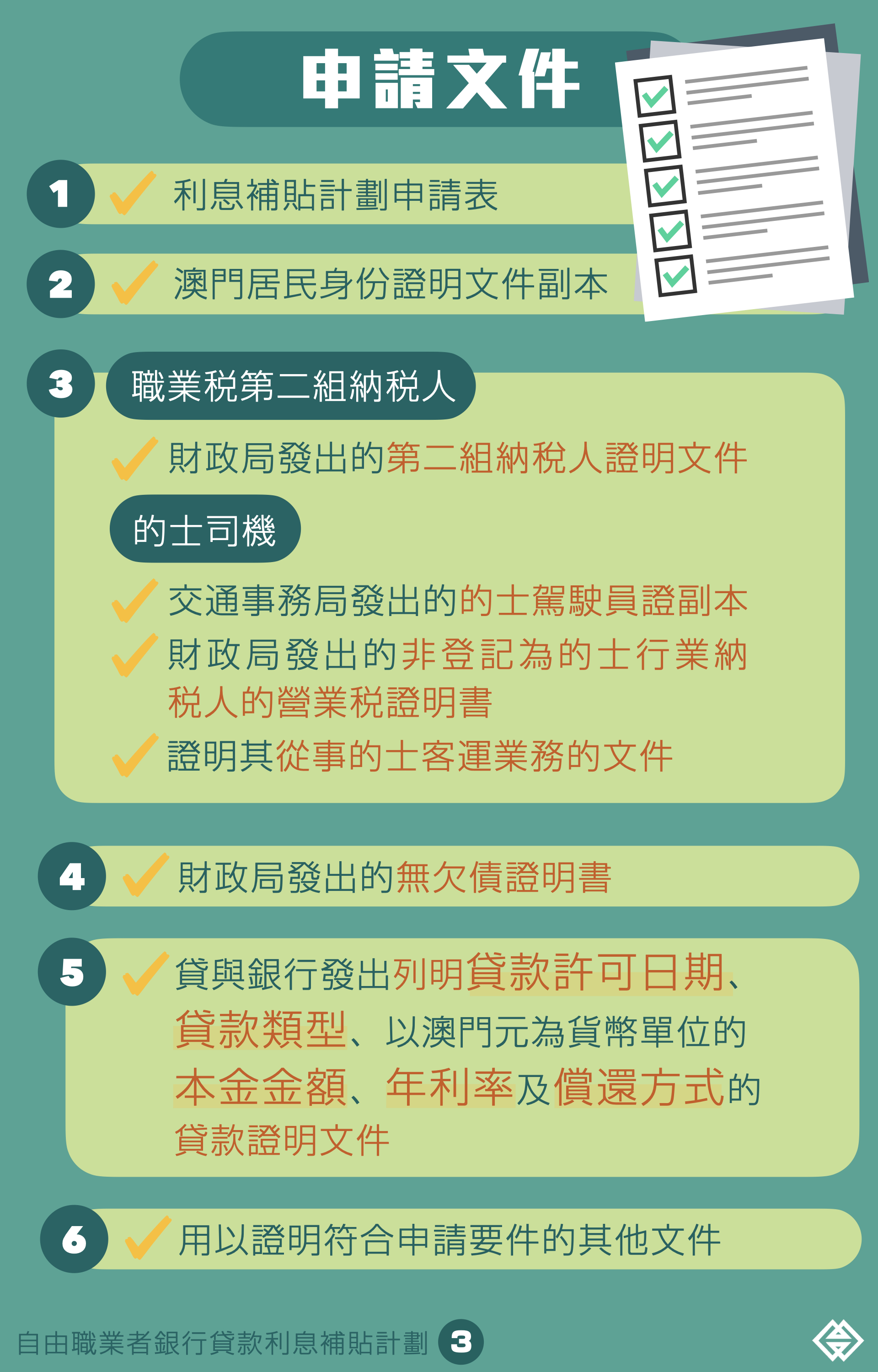 申請人士於申請時,須提交身份證明文件副本、職業證明、財政局發出的無欠債證明書,以及銀行發出的貸款證明文件等。倘存有任何疑問,可致電相關銀行查詢。