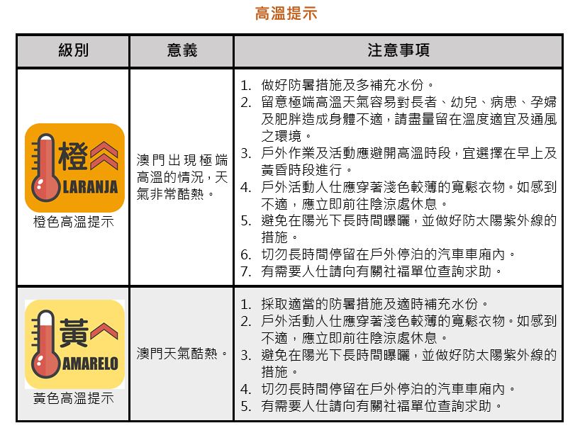 “冷暖天氣提示服務”是綜合考慮本澳出現酷熱和寒冷天氣的程度、持續時間和頻率來制定,目的在酷熱〈黃色高溫提示〉或非常酷熱〈橙色高溫提示〉天氣發生前,提早發出對應的高溫提示,提醒公眾預早做好消暑避暑措施;而當寒冷〈黃色低溫提示〉或非常寒冷〈橙色低溫提示〉天氣來襲時,提早發出提示,避免公眾因為寒冷天氣而影響健康。