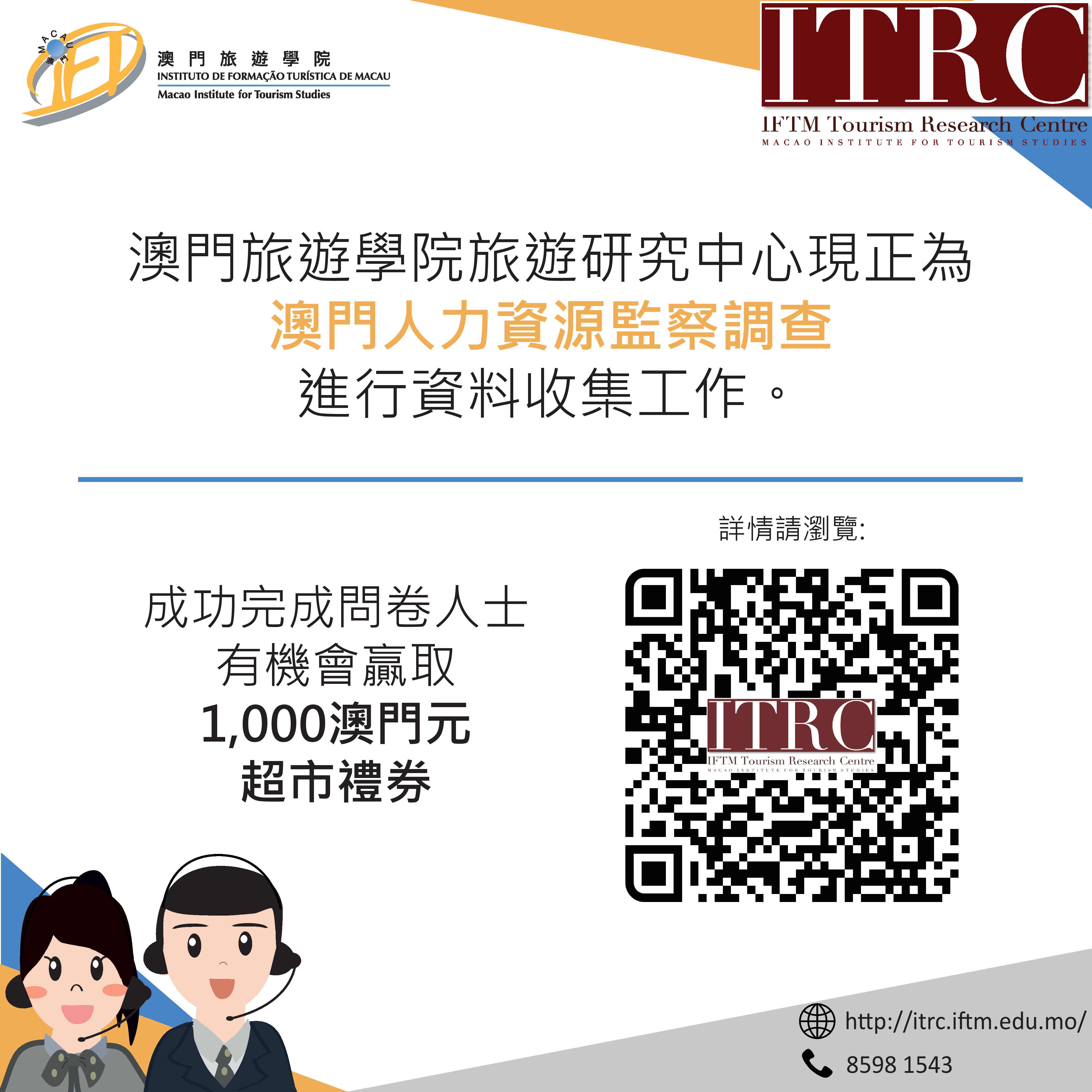 澳門旅遊學院旅遊研究中心現正透過街頭及電話訪問為「澳門人力資源監察調查」進行資料收集的工作。電話調查採用隨機號碼撥號來抽取合資格的受訪者樣本,被抽中的受訪者可以通過電話採訪完成問卷調查,也可選擇通過指定鏈結填寫線上問卷。合資格的受訪者於成功完成問卷後有機會贏取澳門元1,000元超市禮券,期望被抽中的受訪者能踴躍參與。