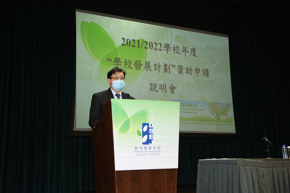 教育發展基金主席老柏生在致辭時表示,特區政府高度重視推動教育發展,培育人才。教育發展基金一直配合澳門教育長遠規劃,投入資源,推出多元資助計劃,支持學校開展各類教育計劃和活動,並表示學校需訂明清晰的工作守則,以提高學校人員的廉潔意識,強調學校有舉報涉嫌違法行為的義務。教青局教育研究暨資源廳廳長黃健武及教育廳廳長黃嘉祺分別介紹2021/2022學校年度“學校發展計劃”資助申請章程,並和與會者進行交流。