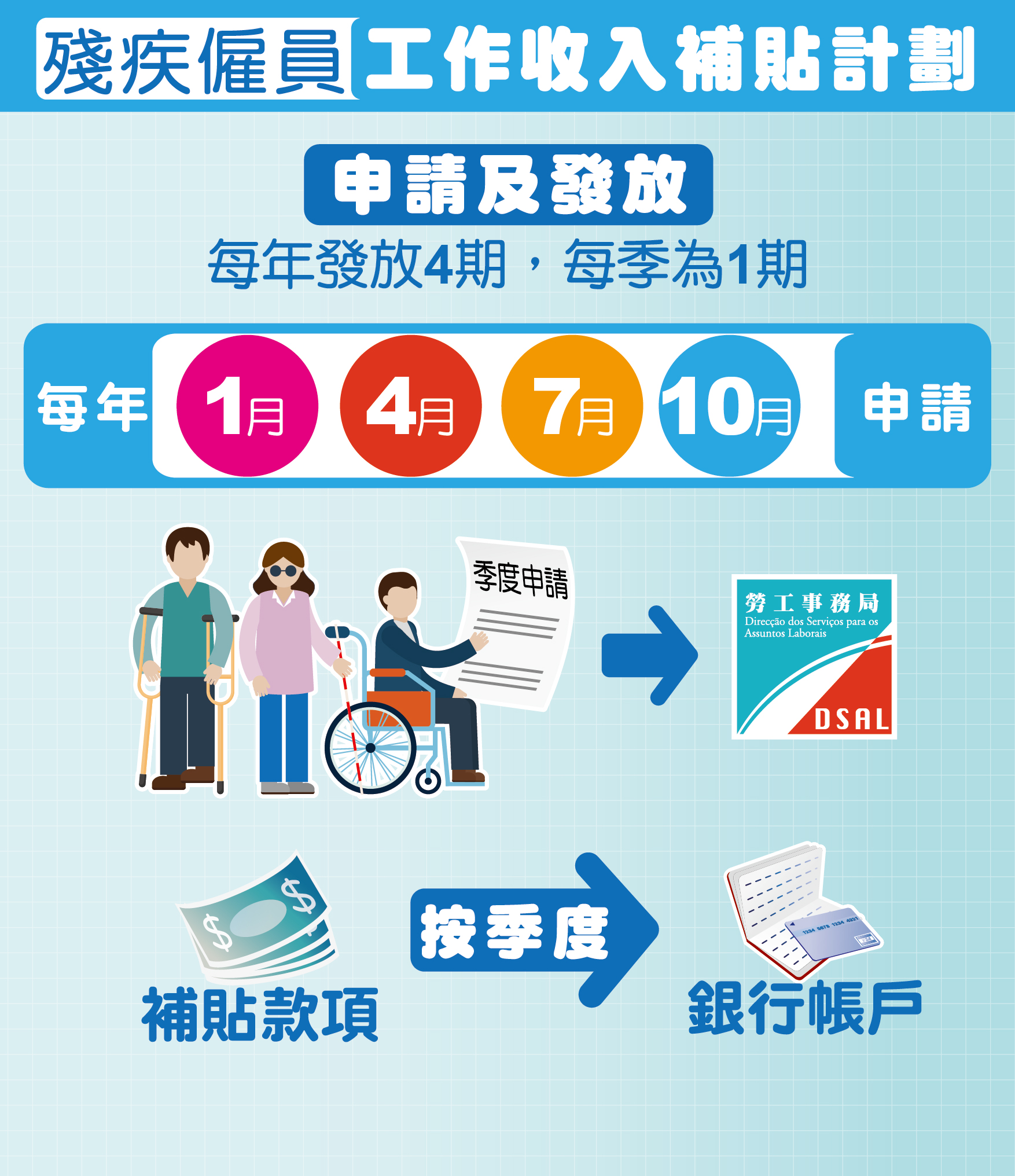 因應《殘疾僱員工作收入補貼計劃》行政法規已於2020年11月1日正式生效,同時,勞工局將於2021年1月1日開始負責審批計劃生效後補貼的申請及發放工作,故符合現行規定的殘疾僱員,可於每年1月、4月、7月及10月向勞工局申領前一季度的收入補貼。