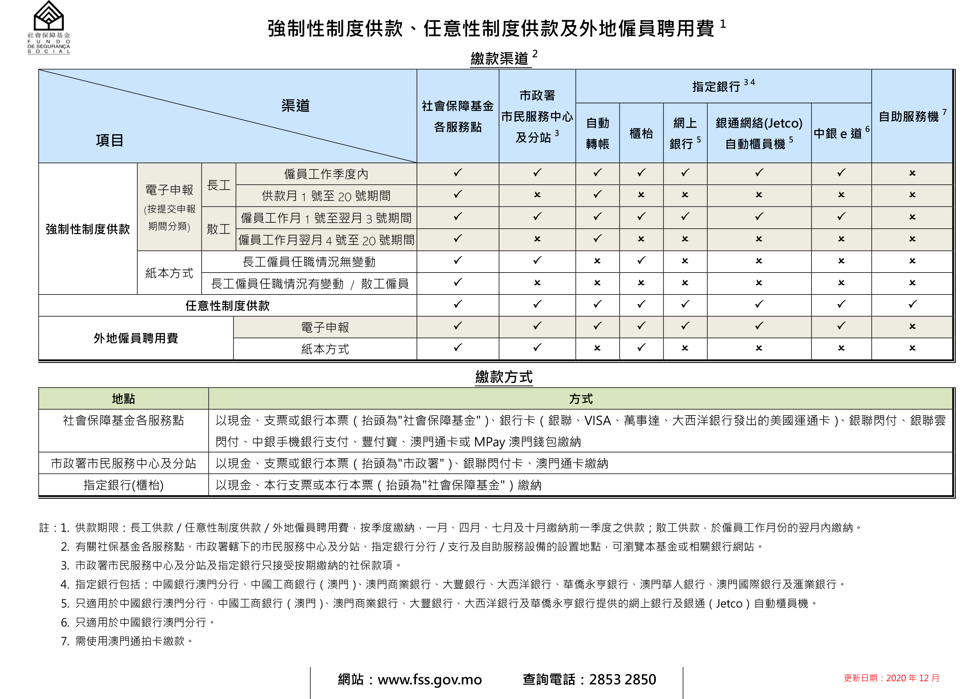 強制性制度供款方面,已開通電子申報服務的僱主建議儘量使用自動轉帳服務,或可使用上述各渠道繳款(自助服務機除外)。至於尚未開通電子申報服務的僱主,除可於社保基金服務點繳納供款及外聘費,倘本地長工僱員當季任職情況無變動,亦可於市政署轄下各市民服務中心及分站,或於指定銀行櫃台繳納款項。