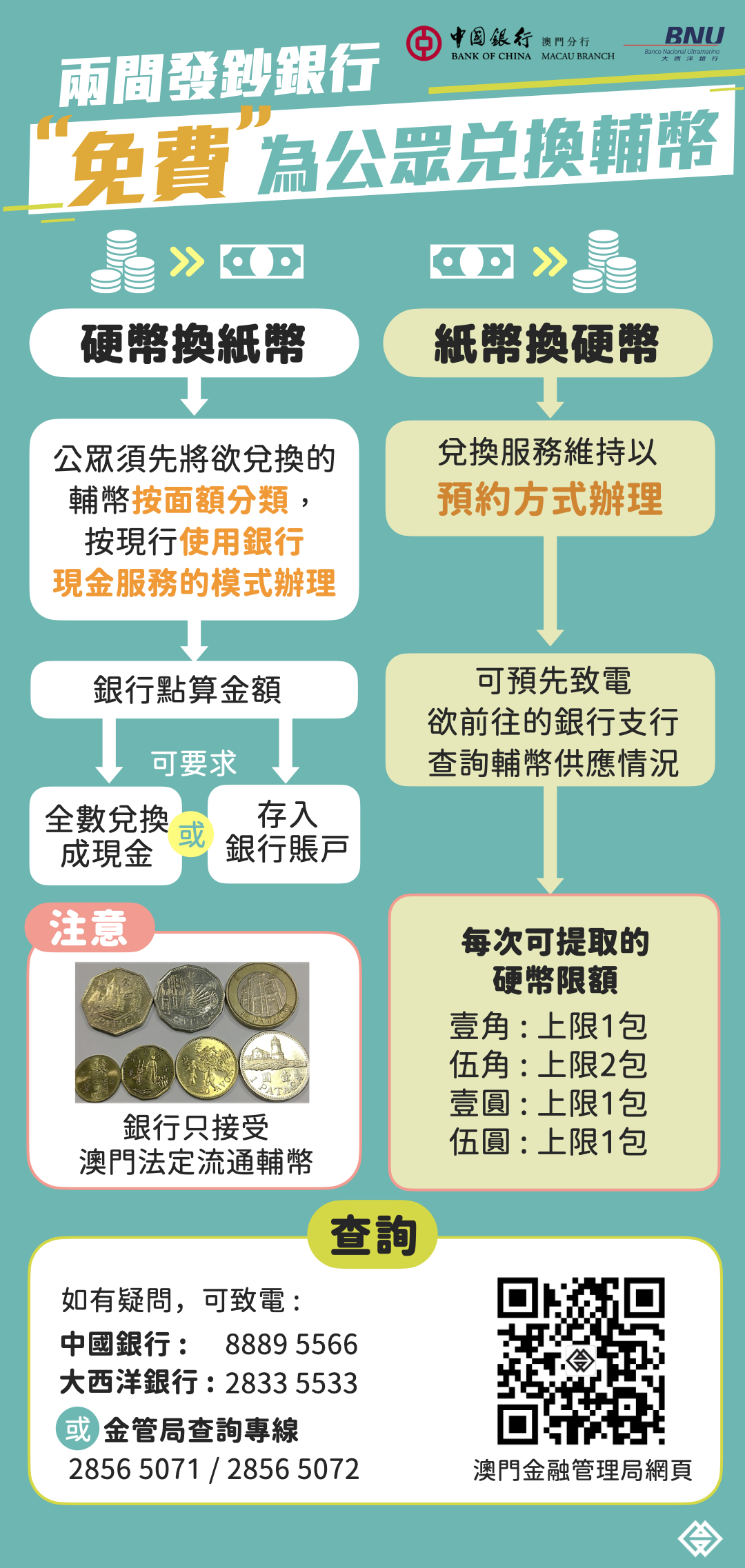 兩家發鈔銀行“免費輔幣兌換服務”