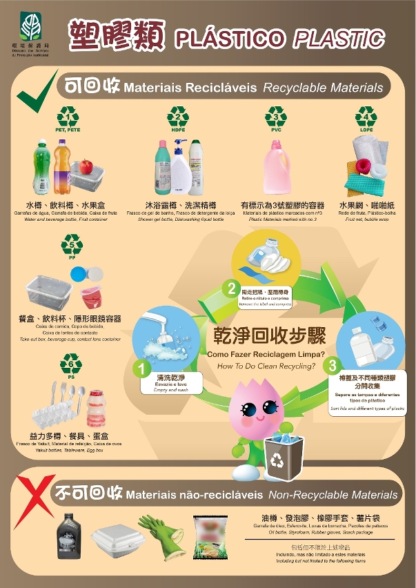 由今年1月1日起,市民可將具1至6號回收標籤的塑膠製品(發泡膠除外),包括所有飲品和清潔產品的膠樽、透明啪啪紙、生果網、保鮮紙、平口保鮮袋等,將之清洗乾淨後帶至回收點。環保局亦會繼續加強相關宣傳推廣,並已將有關分類回收小知識上載至網頁(https://www.dspa.gov.mo/ecofunweb/tc/1knowledge.aspx)。