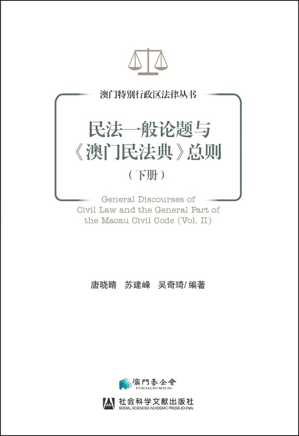 “澳門特別行政區法律叢書”之一,由唐曉晴、蘇建峰及吳奇琦編著的《民法一般論題與〈澳門民法典〉總則》(下冊),經已由澳門基金會與社會科學文獻出版社聯合出版,並於全國包括澳門地區同時發行。該書在《澳門民法典》總則的基礎上對民法的一般論題進行了釐清,既為民法的科學研究提供了理論依據,亦形成了以民法基本範疇為結構標準的教材,對澳門民法教學有一定的指導意義。