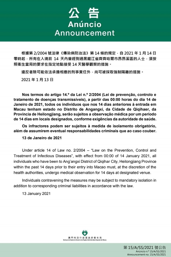 新型冠狀病毒感染應變協調中心宣佈,因應黑龍江省的最新疫情發展,衛生局根據第2/2004號法律《傳染病防治法》第14條的規定,自2021年1月14日零時起,所有在入境前14天內曾經到過黑龍江省齊齊哈爾市昂昂溪區的人士,須按照衛生當局的要求在指定地點接受14天醫學觀察,違反者除可能依法承擔相應的刑事責任外,尚可被採取強制隔離的措施。
