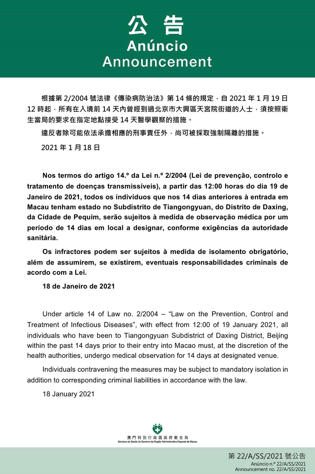 新型冠狀病毒感染應變協調中心宣佈,因應河北省及黑龍江省的最新疫情發展,衛生局根據第2/2004號法律《傳染病防治法》第14條的規定,自2021年1月19日12時起,所有在入境前14天內曾經到過吉林省長春巿的二道區、綠園區或北京市大興區天宮院街道的人士,須按照衛生當局的要求在指定地點接受14天醫學觀察,違反者除可能依法承擔相應的刑事責任外,尚可被採取強制隔離的措施。