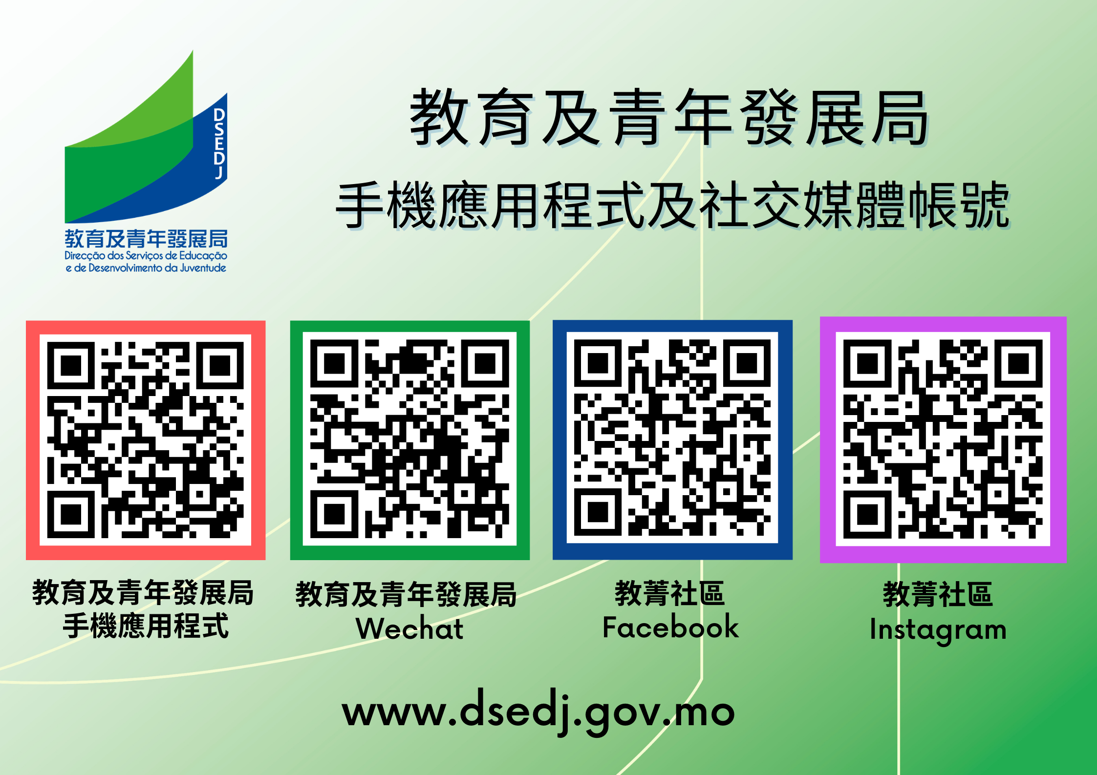 社交媒體方面,教育及青年發展局WeChat、Facebook及Instagram專頁帳號已更新,市民可於WeChat搜尋“澳門教育及青年發展局”或“dsedjmacau”,或於Facebook及Instagram專頁搜尋“教菁社區”或“dsedjmacau”,瀏覽教青局最新資訊。