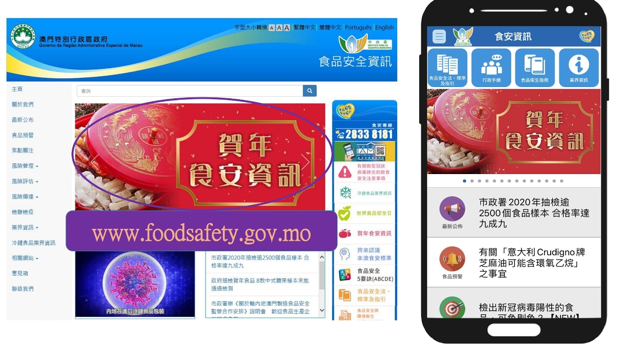 市政署已於食品安全資訊網開設「賀年食安資訊」專頁及「有關新型冠狀病毒肺炎的飲食安全注意事項」專頁,市民可登入www.foodsafety.gov.mo或下載「食安資訊」手機應用程式,獲取相關資訊。