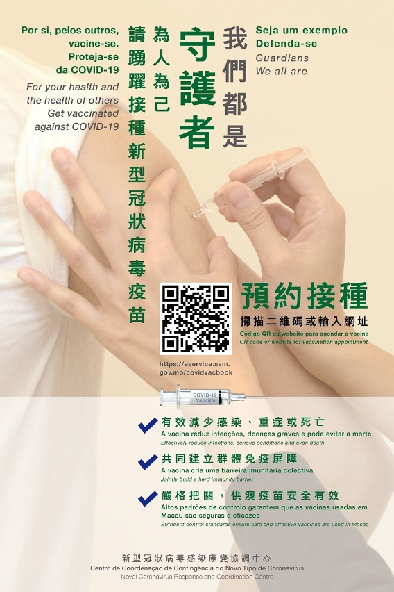 特區政府今日正式啟動新型冠狀病毒疫苗的接種,首階段已優先開放前線抗疫人員、高職業暴露的人群(例如航空及公共交通人員、接觸冷鏈食品和生鮮食品的工作人員等),以及需要前往高危地區的人士接種,截至今(9)日下午6時,開放首日已有509人接種第一劑新型冠狀病毒疫苗,第一劑後的28天後可接種第二劑疫苗。而第二階段擴展至全澳居民,今(9)日中午12時起開放預約,截至今(9)日下午6時,已成功預約接種人士共3,052人次,最早於2月22日起接種。而有需要協助進行網上預約的人士,可到社工局轄下8個站點由工作人員協助預約。有關疫苗詳情,可瀏覽新冠病毒疫苗資訊專頁(https://www.ssm.gov.mo/apps1/covid19vaccine/ch.aspx),有意接種人士可輸入網址(https://eservice.ssm.gov.mo/covidvacbook)或掃描二維碼(QR Code,見附圖)登入衛生局接種新型冠狀病毒疫苗預約系統預約。特區政府呼籲居民踴躍接種新型冠狀病毒疫苗,共同建立社區免疫屏障,阻斷疾病傳播。