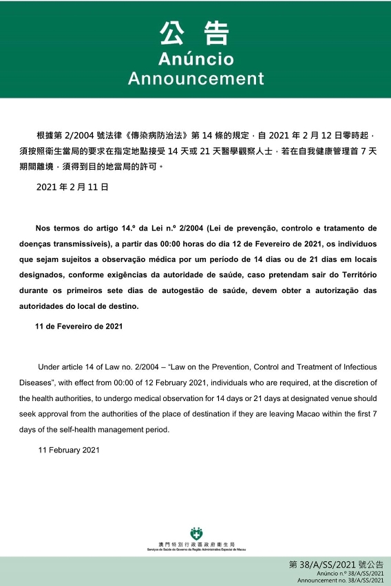 新型冠狀病毒感染應變協調中心宣佈,為配合內地疫情防控措施,衛生局根據第2/2004號法律《傳染病防治法》第14條的規定,自2021年2 月12日零時起,在本澳完成醫學觀察並在接受自我健康管理首7天期間離境,須得到目的地當局的許可。因此,有關人士不可經機場或碼頭前往內地,經陸路離境時,將會交給珠海口岸當局,以便其接受內地防疫部門的措施。因香港沒有相應要求,前往香港的人士則不受新措施影響。