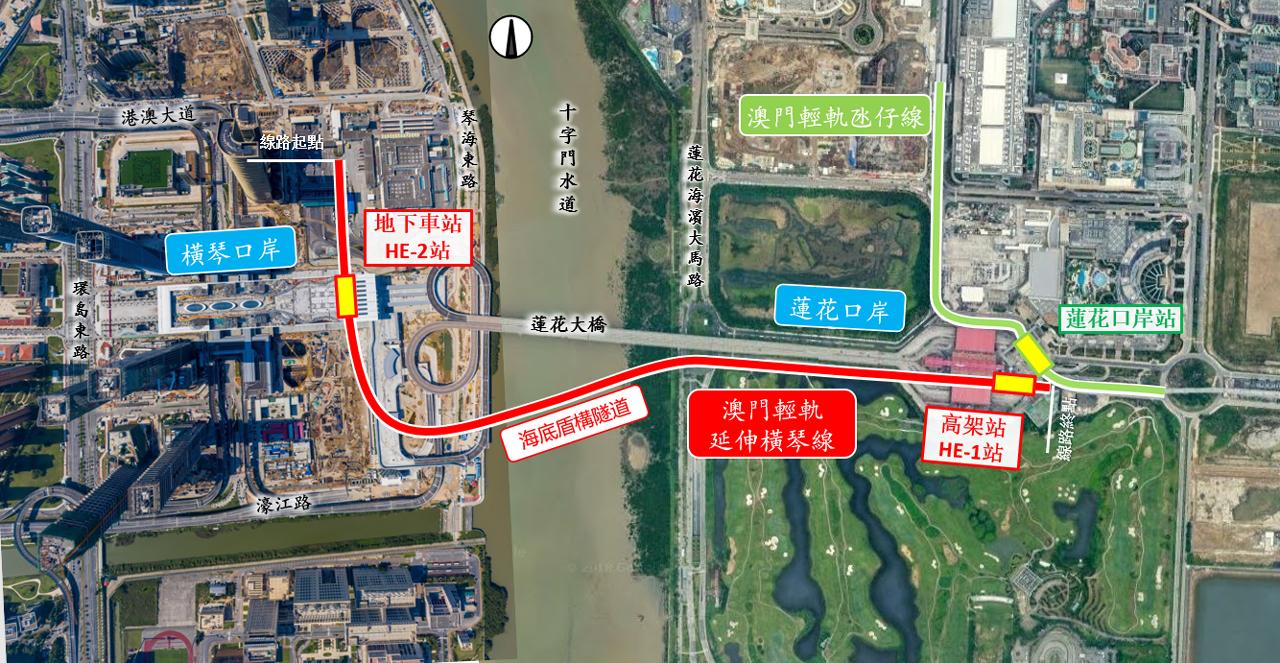輕軌橫琴線主體建築由高架橋、河底隧道及兩個車站組成,走線全長約 2.2公里,其中隧道段約900米。車站分別位於現時氹仔線蓮花大橋站旁的“HE1站”,以及位於橫琴口岸地庫下層的“HE2站”。走線以高架方式始於“HE1站”,沿蓮花大橋方向自高架逐漸下降,以河底隧道方式穿過十字門水道進入珠海橫琴,最終止於橫琴口岸的“HE2站”。