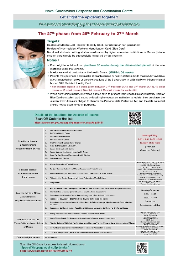 新型冠狀病毒感染應變協調中心今(22)日公佈,第27輪保障口罩供應澳門居民計劃於週五(26日)開始,售賣期間為30日,即2021年2月26日至3月27日,期間每人可一次性購買30個口罩,售價合共24澳門元。對象包括本澳永久及非永久居民、持外地僱員身份認別證(俗稱藍咭)人士,以及持澳門各高等院校學生證的非本地學生,學生在購買口罩時須出示所就讀高等院校的學生證,經系統成功識別學生證資料後方能購買。