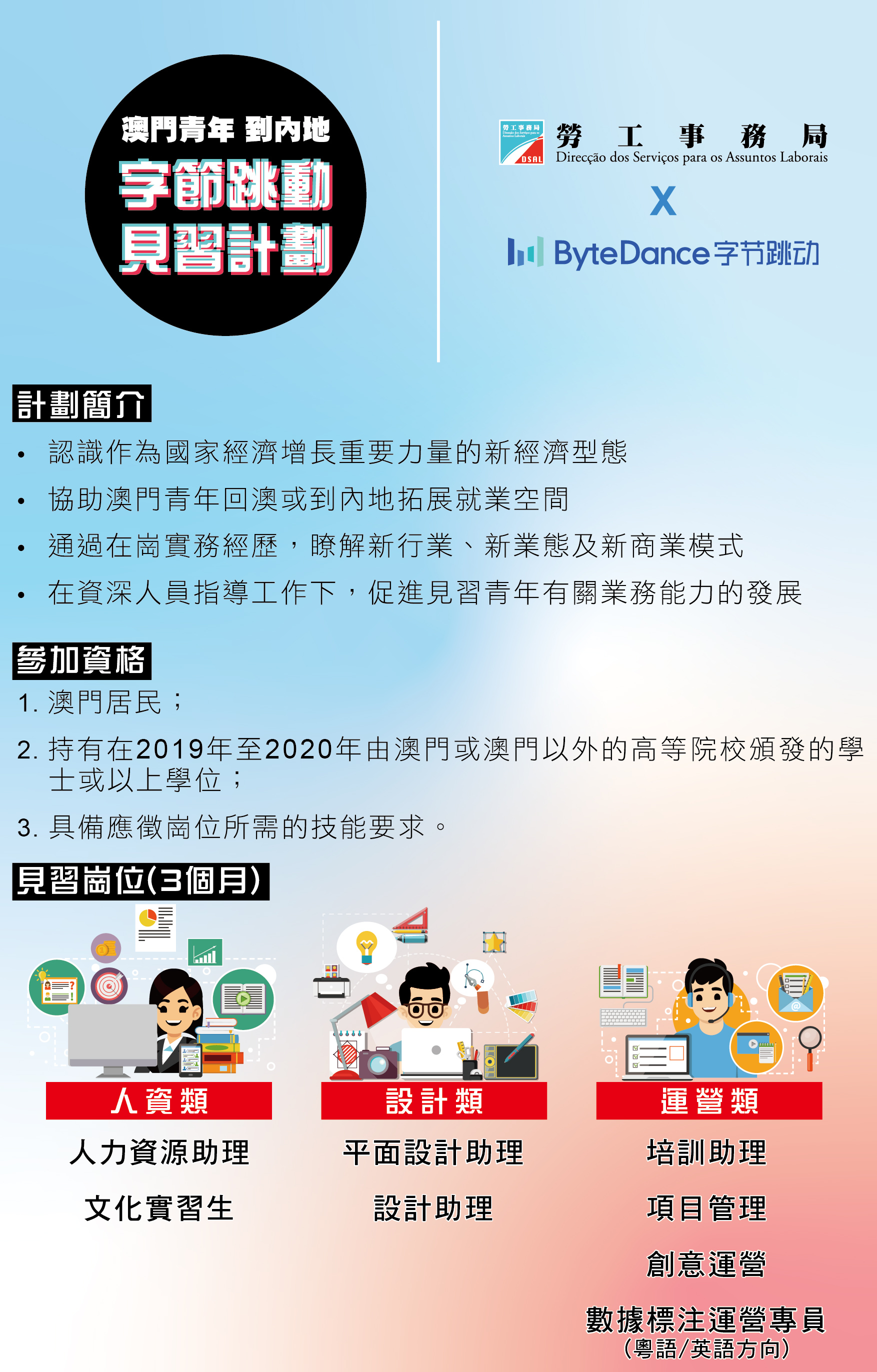 勞工局與“北京字節跳動科技有限公司”合作的青年見習計劃已於2月初推出,報名期至2月底,見習為期3個月。由企業資深人員指導工作,促進澳門青年的業務能力的發展,繼續深化與內地企業機構的合作,支持澳門青年到內地企業就業,為日後特區產業發展儲備人才。