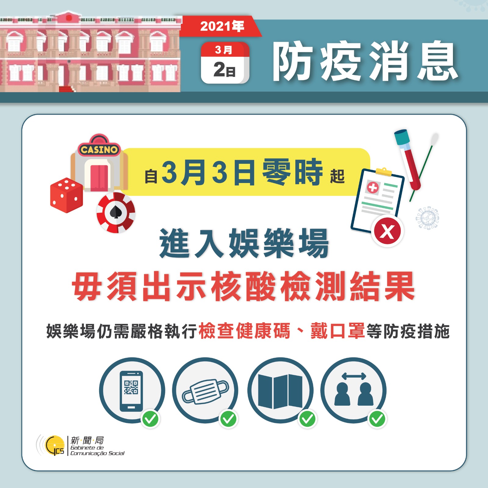 自3月3日零時起,進入娛樂場毋須出示核酸檢測結果。