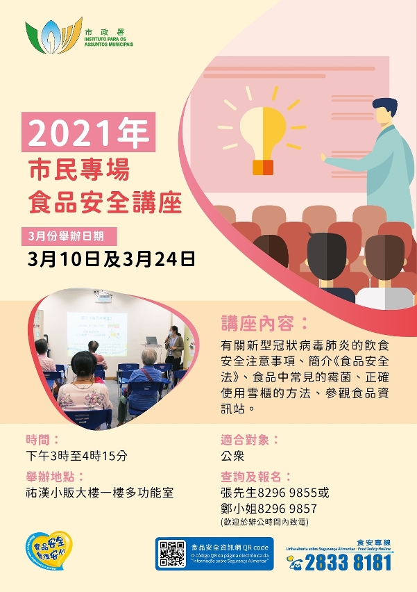 「市民專場之食品安全講座」課時約一小時,以粵語進行,費用全免,有興趣參與之市民可於辦公時間內致電8296 9855或8296 9857報名參加。配合特區政府防疫工作,參與者在進場時須測量體溫、佩戴口罩及出示澳門健康碼。
