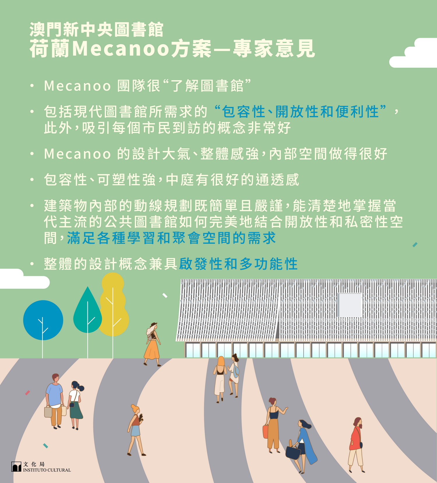 荷蘭Mecanoo團隊所設計的方案符合各項評選準則,獲得專家較好的評價,成為中選方案。專家認為整體的設計概念兼具啟發性和多功能性;建築物內部的動線規劃既簡單且嚴謹,能清楚地掌握當代主流的公共圖書館如何完美地結合開放性和私密性空間,滿足各種學習和聚會空間的需求;整體設計方案以吸引每個市民的到訪為概念,透過具包容、開放和便利性的設計,讓圖書館成為每個人都能感受到歸屬的地方。Mecanoo團隊在國際建築設計界具有相當份量,近年曾參與多個圖書館建造設計項目,屢獲國際建築設計大獎,在設計和實踐圖書館建築項目上擁有豐富的經驗。文化局在新聞發佈會上向四個參與新中圖設計團隊表示感謝。