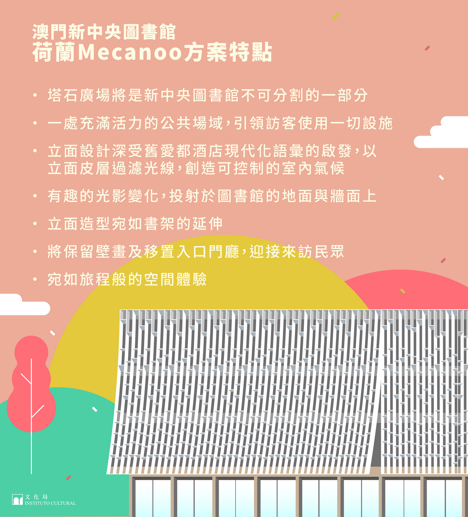 文化局今日(3月8日)就有關澳門新中央圖書館設計方案評選結果舉行新聞發佈會,局長穆欣欣、副局長梁惠敏、參與新中央圖書館評選工作的專家代表吳建中博士、公共圖書館管理廳廳長呂志鵬出席,介紹新中央圖書館設計方案的評選結果及未來功能規劃。未來,新中央圖書館將朝全齡化、多元化及生活化的方向,集多元與包容特色,成為城市知識中心,可供閱讀、交流、學習、休閒、發揮創意,並構建與資訊科技結合的智慧型圖書館,文化局將繼續積極推進相關工作,並適時向社會公佈各項進展。