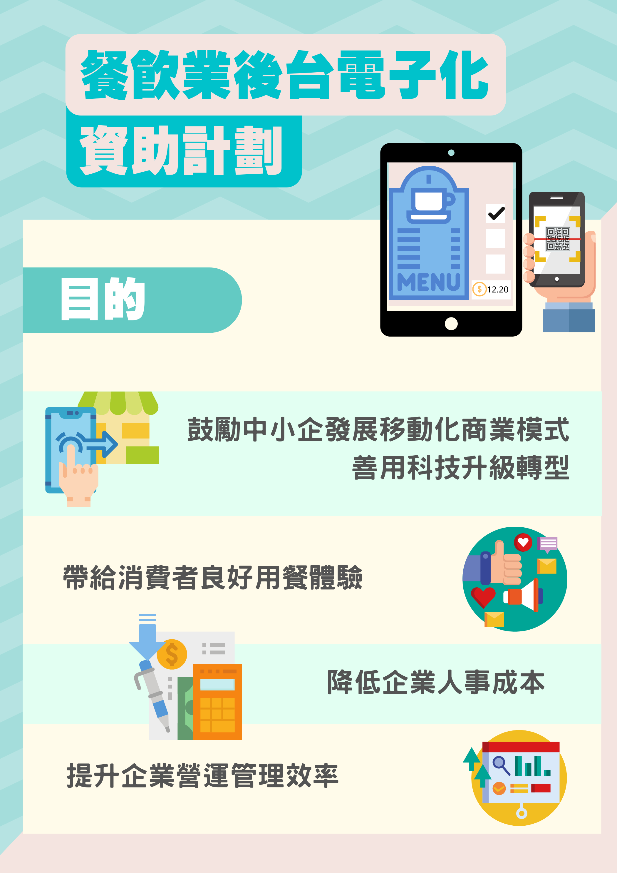 為鼓勵中小企發展移動化商業模式,尤其是利用數字化解決方案提升營運效率,首階段經濟及科技發展局將支持商會推出“餐飲業後台電子化資助計劃”。參與的中小企可通過安裝系統及設備以實現落單、通知後台及付款全程電子化。