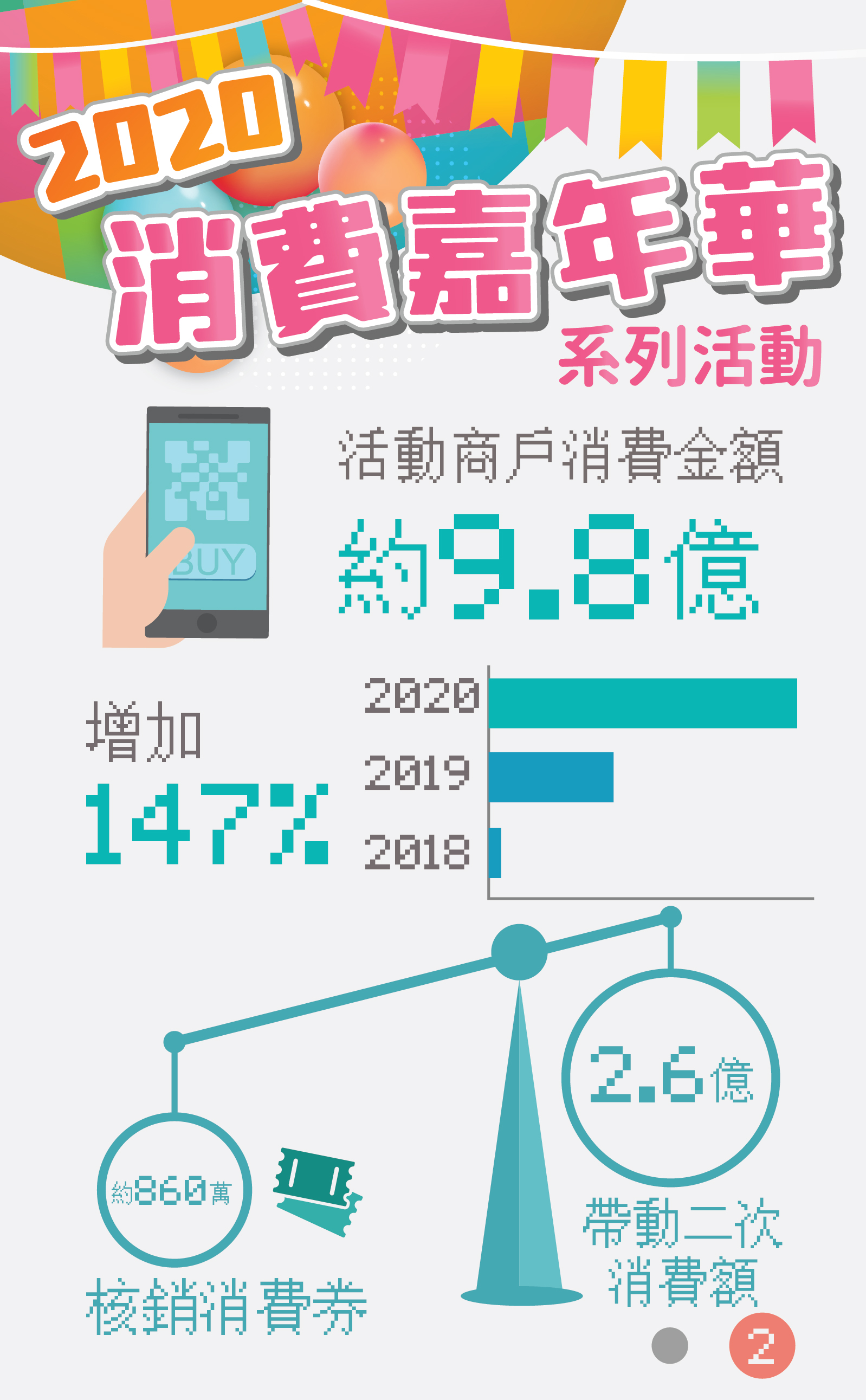 2020年的“消費嘉年華”系列活動合共獲超過1.6萬間商戶參加,涉及交易額逾9.8億澳門元,均較去年增加超過1倍。而截至今年2月底,近860萬澳門元的“中小企電子消費券”已被核銷,導向中小商戶的二次消費額超過2.6億元。