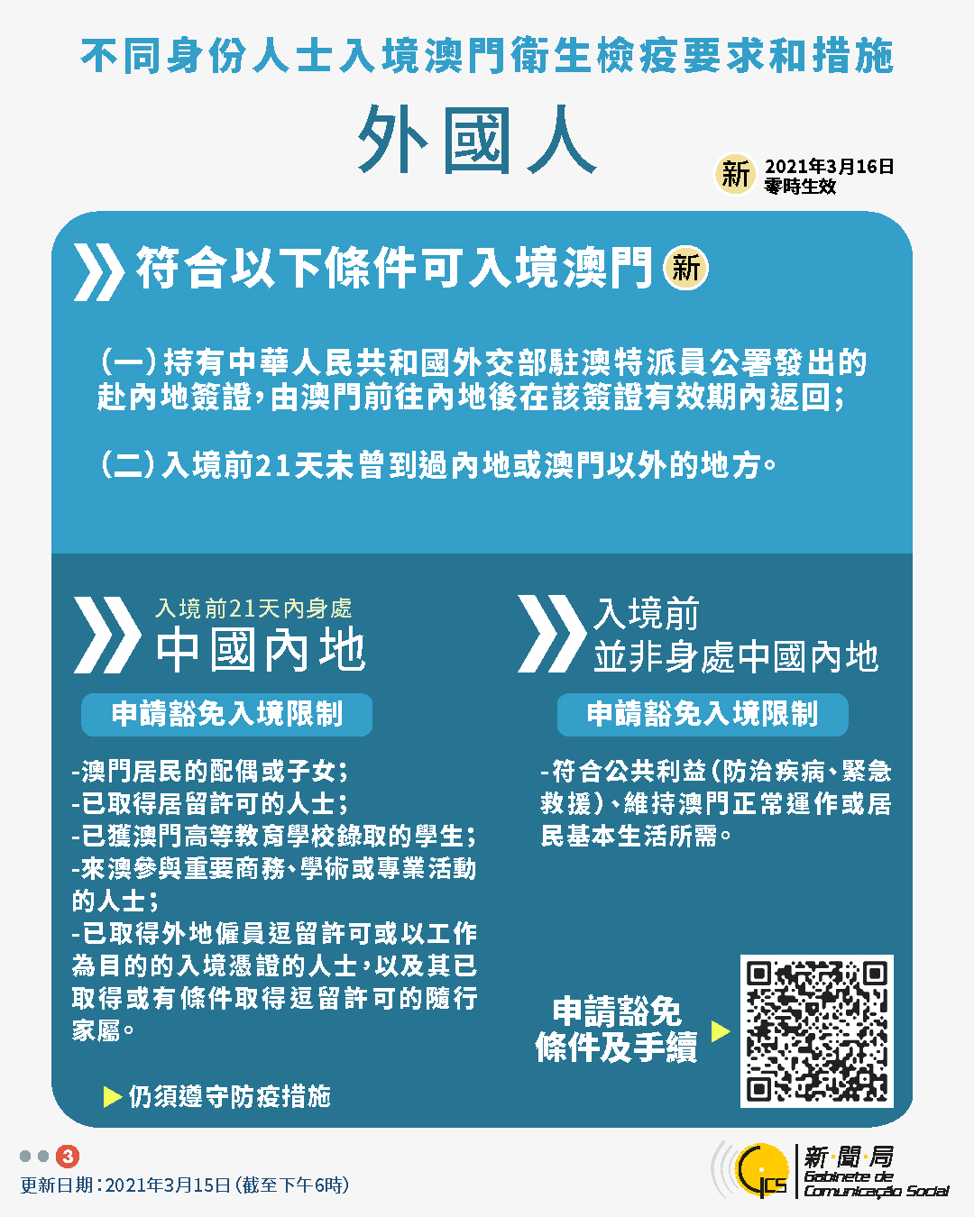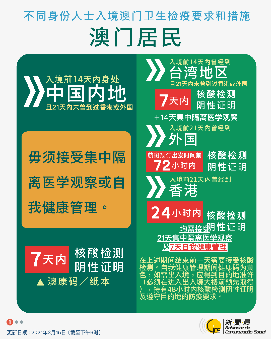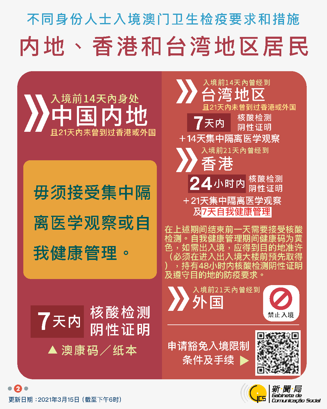 【圖文包】2021/03/15最新入境澳門衛生檢疫要求和措施