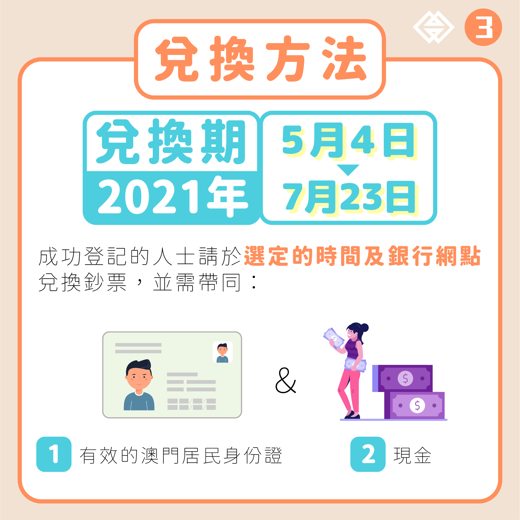 兌換期為2021年5月4日至7月23日,成功登記的人士請於所選定的時間及銀行網點,帶同其有效的澳門居民身份證親身前往兌換。如需委託他人代領,代表人則須帶同自己的身份證明文件正本以及提交下列文件: