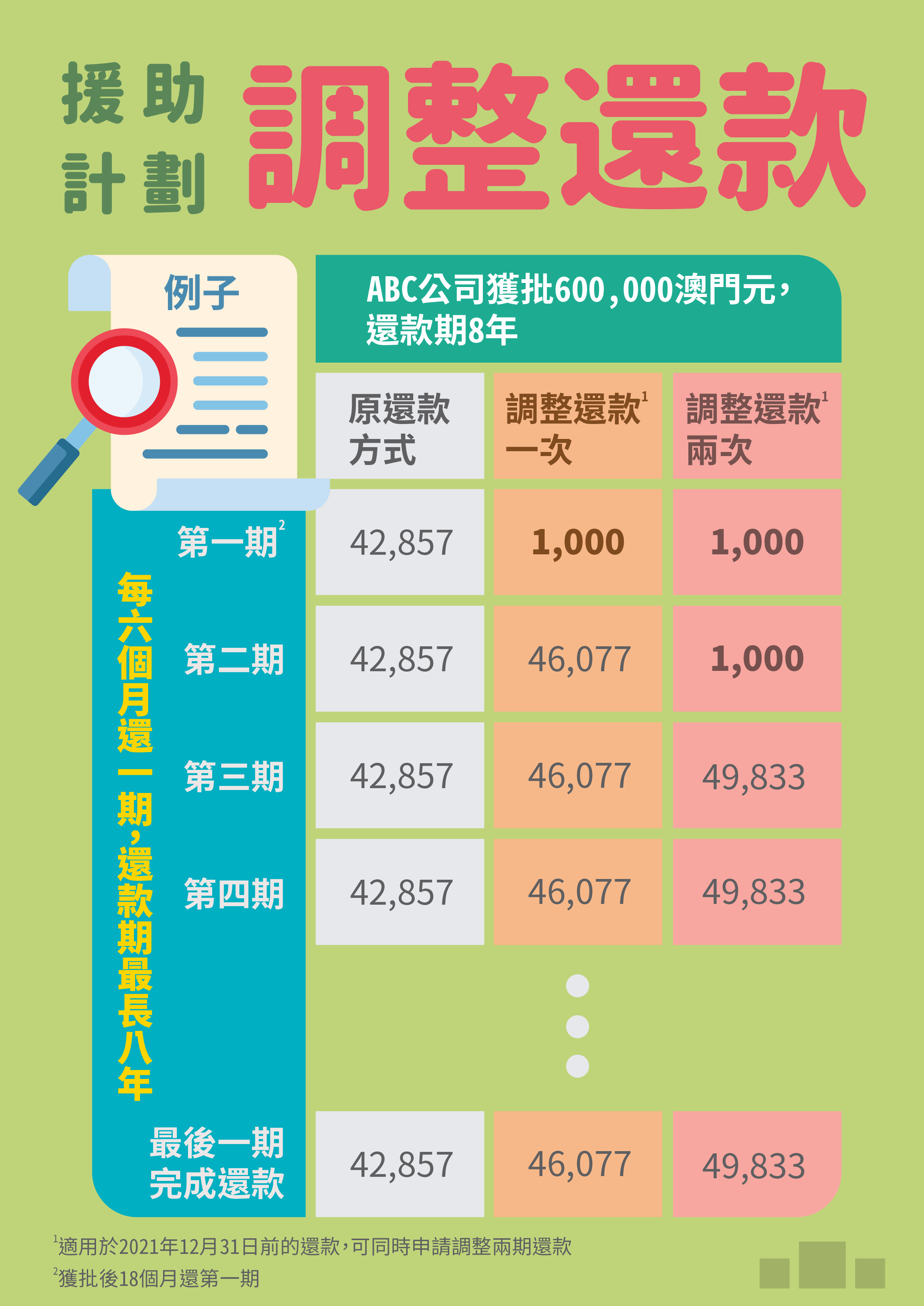 有關措施適用於調整2021年12月31日前的還款,曾於2020年獲批調整還款的企業可以再度提出申請。為便民便商,企業更可申請同時調整兩期還款。但倘處於最後一期還款,或已被取消援助批給的企業,則不適用於有關措施。