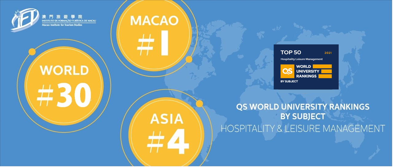 澳門旅遊學院在QS 2021年世界大學「款待及休閒管理」學科排名榜中,位列澳門第1、亞洲第4,連續五年保持亞洲首五名位置,凸顯了學院的全球領先地位。由2017年至2021年,該學科排名所考慮的亞洲院校數量幾乎翻了一番。