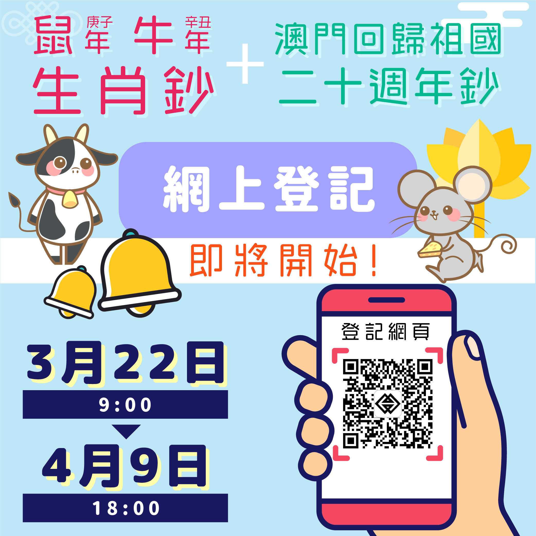 鼠年及牛年生肖鈔,以及早前已發行的澳門回歸祖國二十週年鈔之網上登記將於2021年3月22日(上午9時起)開始,屆時接受澳門居民進行網上預約兌換登記,為期三個星期,至2021年4月9日下午6時止。