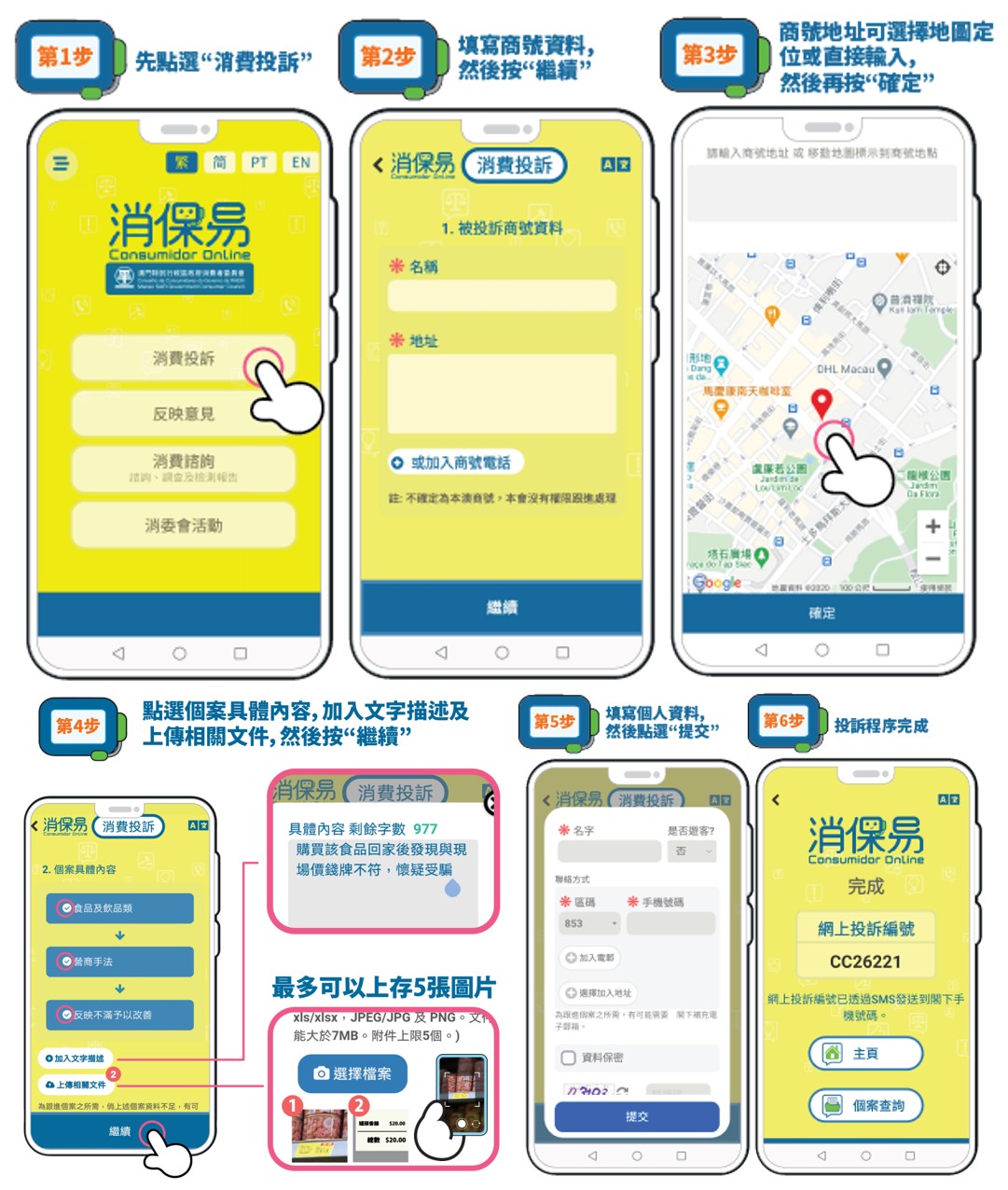 消費者只需將投訴內容以文字輸入“消保易”的“消費投訴”專區,專區並設有上載照片功能,方便消費者將投訴內容配合照片,反映商號的違規行為。同時,平台已預設投訴性質及要求等選項,配以支援手機定位等便民功能,讓消費者更快完成投訴。