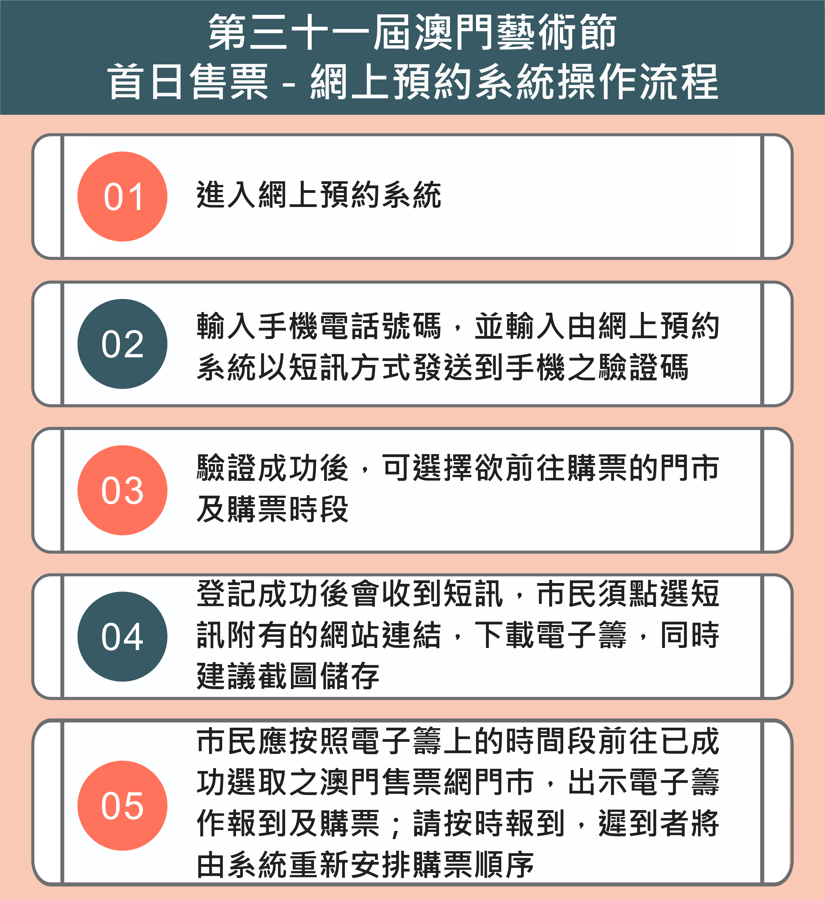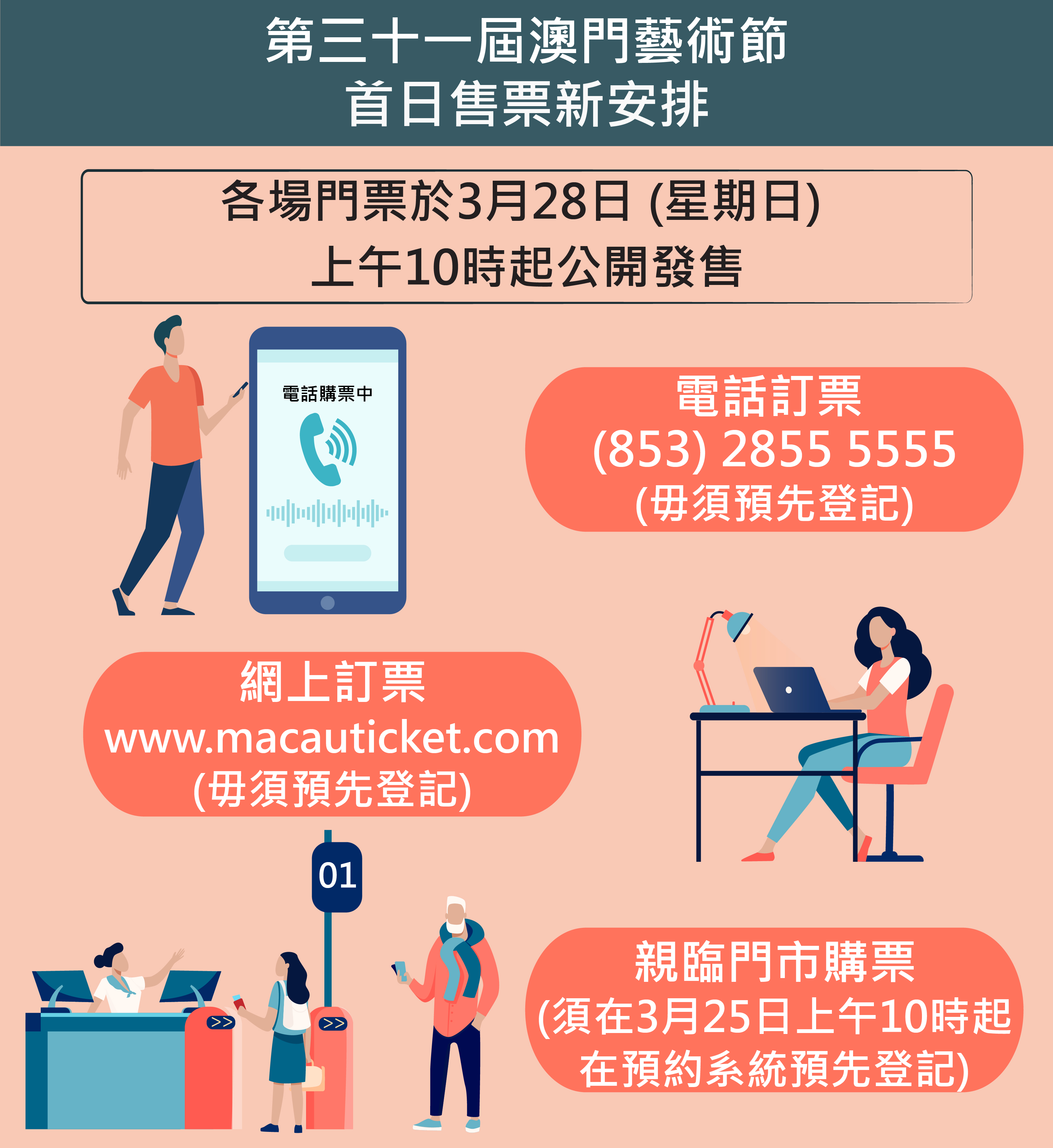 為優化澳門藝術節購票安排,為觀眾帶來省時便捷的購票服務,主辦單位今年同步開通現場及電子多元購票模式,特設首日售票網上預約系統,系統於3月25日(星期四)上午10時起開通,選擇在首日售票當日上午10時至下午3時親臨澳門售票網門市購票之觀眾,透過系統憑手機電話號碼預約購票時段,成功預約者便可按時段前往自選門市購票。有需要協助使用網上預約系統的市民,亦可於預約系統開放期間且澳門售票網門巿營業時間內親臨任何一間澳門售票網門市由專人協助辦理。預約時段名額有限,先到先得,每一組手機電話號碼僅可作一次登記。而選擇電話及網上訂票的市民毋須預先進行登記。