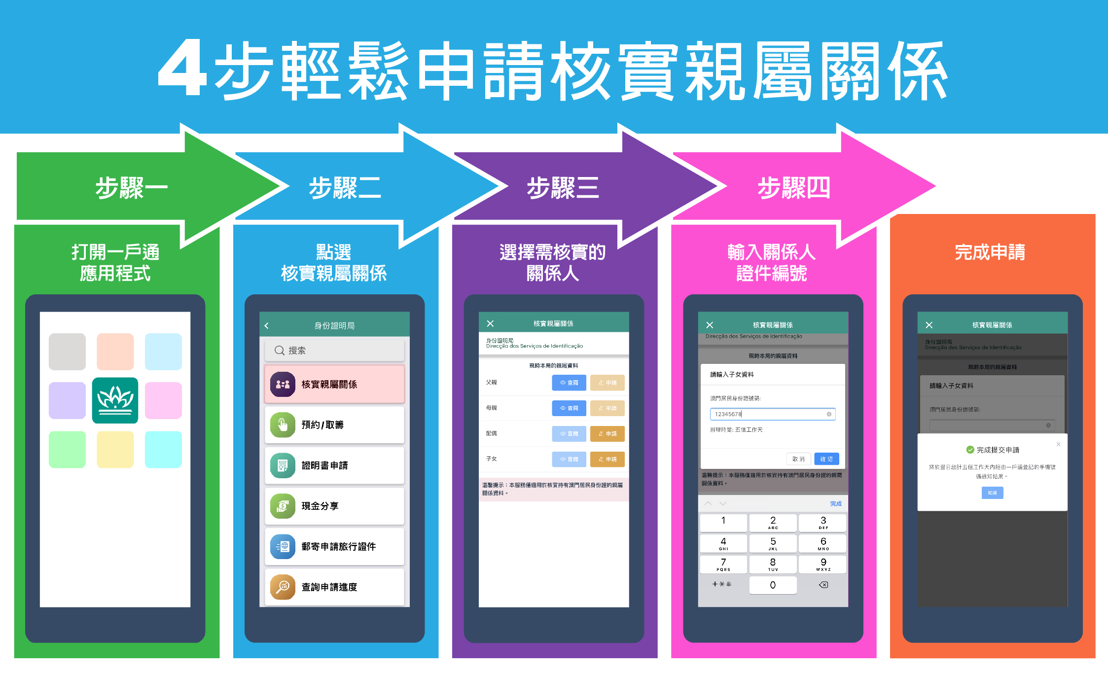 年滿18歲的澳門特區居民身份證持有人可透過“澳門公共服務一戶通”手機應用程式登入帳戶辦理申請,申請時只須輸入關係人的澳門特區居民身份證編號。成功提交申請後,申請人將於五個工作天內收到核實結果,如有需要,身份證明局會通知申請人提供補充文件,被核實的關係資料將會存入申請人及關係人的澳門居民身份檔案內。相關服務,將有助未來由父母(監護人)透過身份識別(面容識別),為未滿18歲的未成年子女辦理一戶通線上開戶。此外,隨着未來一戶通逐步推出更多與市民生活息息相關的服務,將惠及更多不同年齡層的市民。