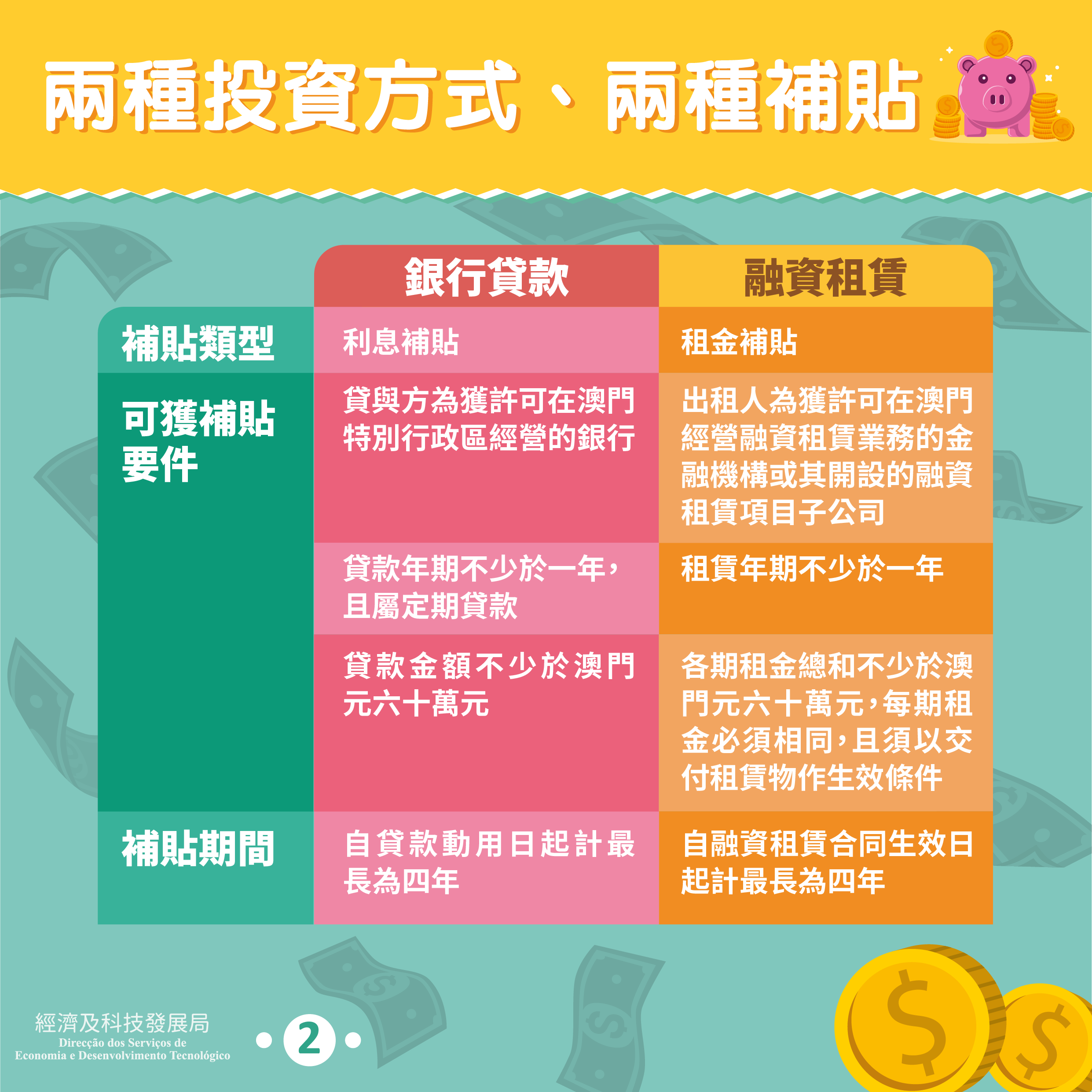 根據第7/2021號行政法規《鼓勵企業升級發展補貼計劃》,符合資格的投資者,當透過銀行貸款或融資租賃的方式,投資有助澳門經濟發展的項目時,可獲得利息或租金補貼,補貼的期間最長為四年。