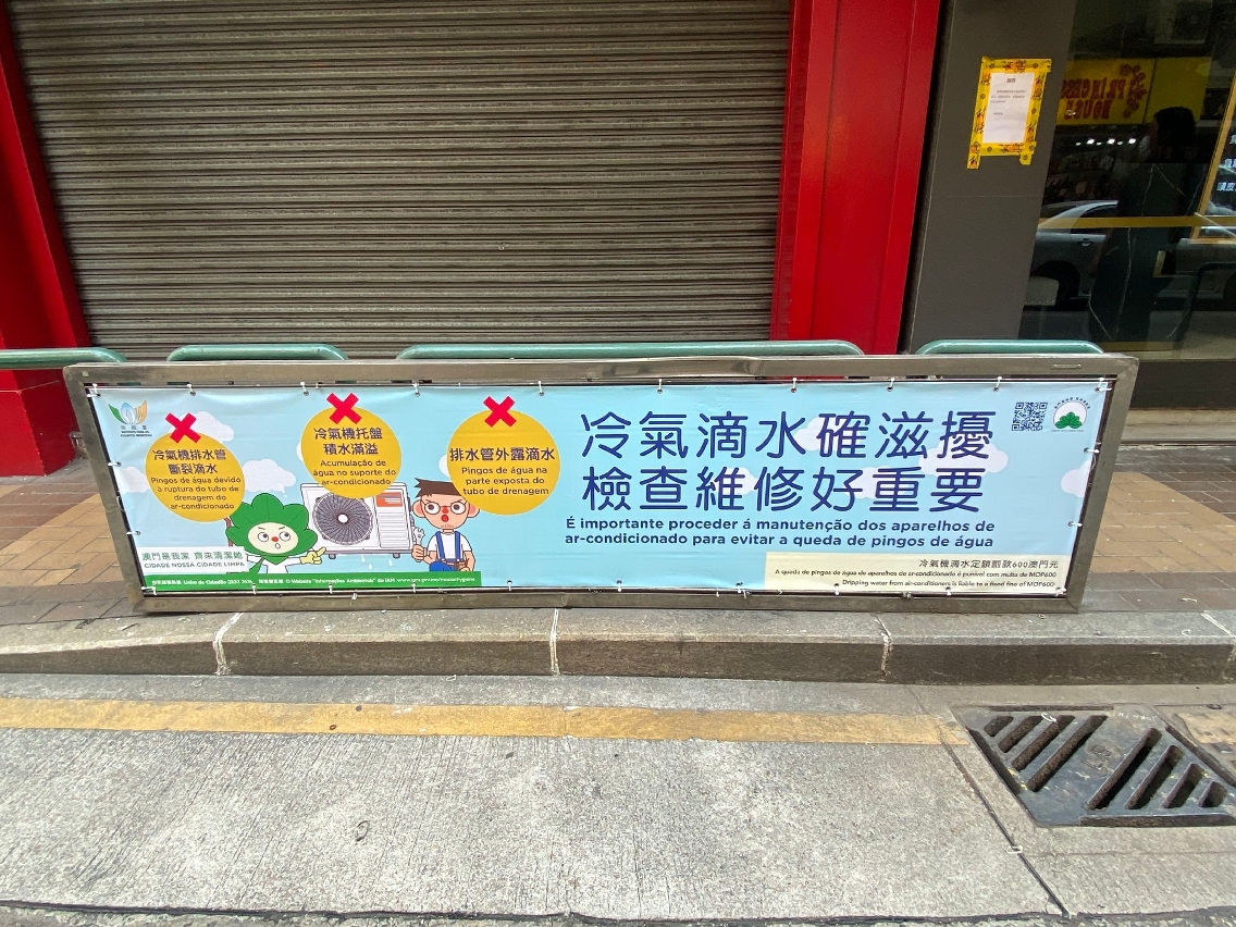 市政署亦持續向社區加強宣傳,透過不同途徑,如張貼海報、派發單張、安裝燈箱廣告及宣傳橫額、邀請本澳團體協助宣傳、在電台播放宣傳聲帶等,向市民宣傳「預防冷氣機滴水,妥善安裝排水設備」的訊息,又計劃於電視台、巴士、的士、樓宇大堂、超市、便利店、市政署轄下設施播放宣傳短片,並上載至市政署網頁宣傳,提醒市民注意冷氣機滴水問題,主動作出改善,避免影響他人。