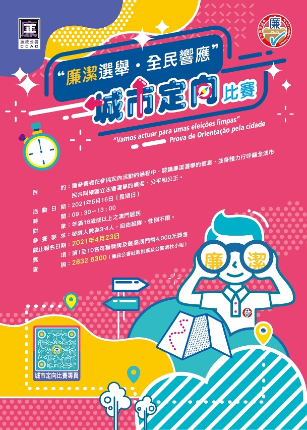 活動詳情可掃瞄活動專頁二維碼或登入廉署網頁www.ccac.org.mo瀏覽,查詢請電2832 6300與廉政公署社區推廣及公關處杜小姐聯絡。