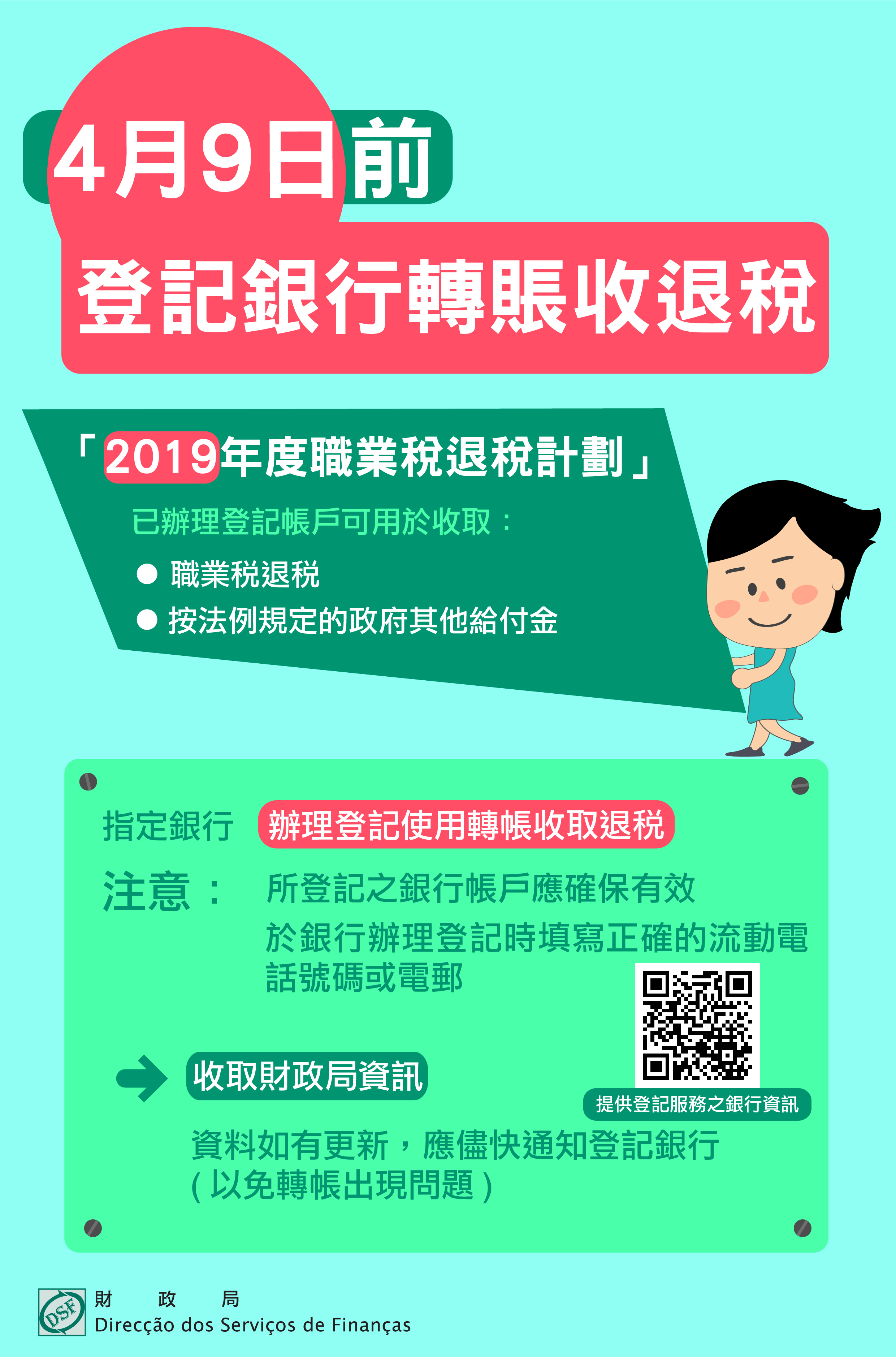 凡符合「二零一九年度職業稅退稅計劃」資格的納稅人,如想使用銀行轉帳方式收取退稅,但仍未辦理登記的,須於四月九日前到指定銀行或以其提供電子方式辦理轉賬登記,其餘未有銀行轉帳登記納稅人的退稅款項,會按情況,稍後以劃線支票或結算單退回。