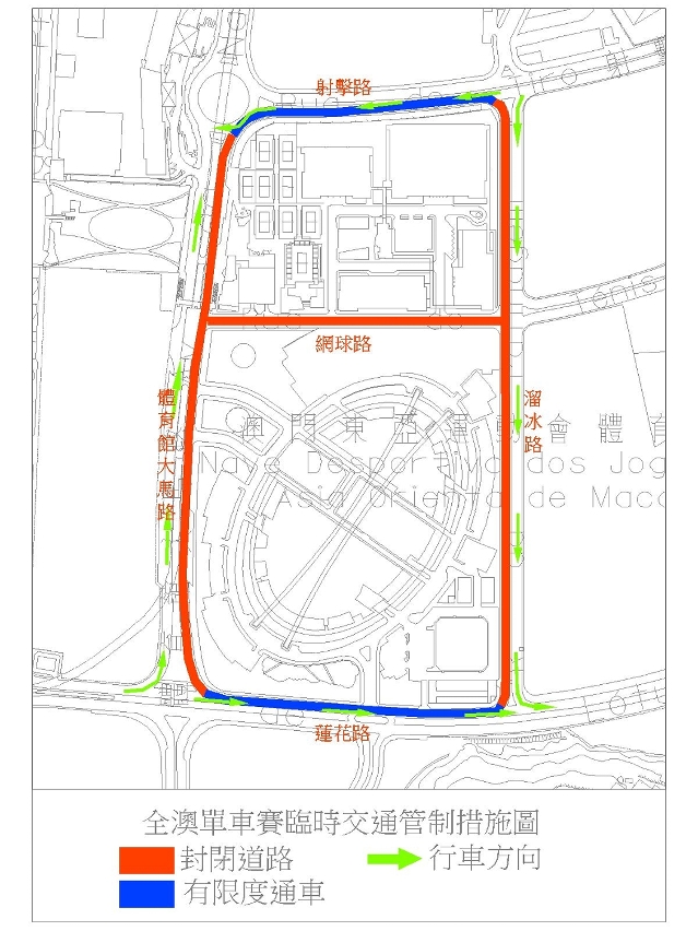 配合中國澳門單車總會舉辦賽事,4月25日(周日)上午6時30分至下午1時15分東亞運動會體育館一帶路段實施臨時交通措施;50(往路環市區)及MT4(往關閘)巴士路線同日上午6時30分起改道行駛,臨時不停靠“東亞運/保齡球中心”及“澳門東亞運動會體育館”巴士站,乘客可選用“路氹東/永利皇宮”及“蓮花路/蓮花圓形地-1”站,直至賽事結束,詳情可查閱澳門公共汽車股份有限公司網頁http://www.tcm.com.mo/web/NewsVB/data/647_cn.pdf及澳門新福利公共汽車有限公司網頁https://www.transmac.com.mo/route-change/20210425op/。