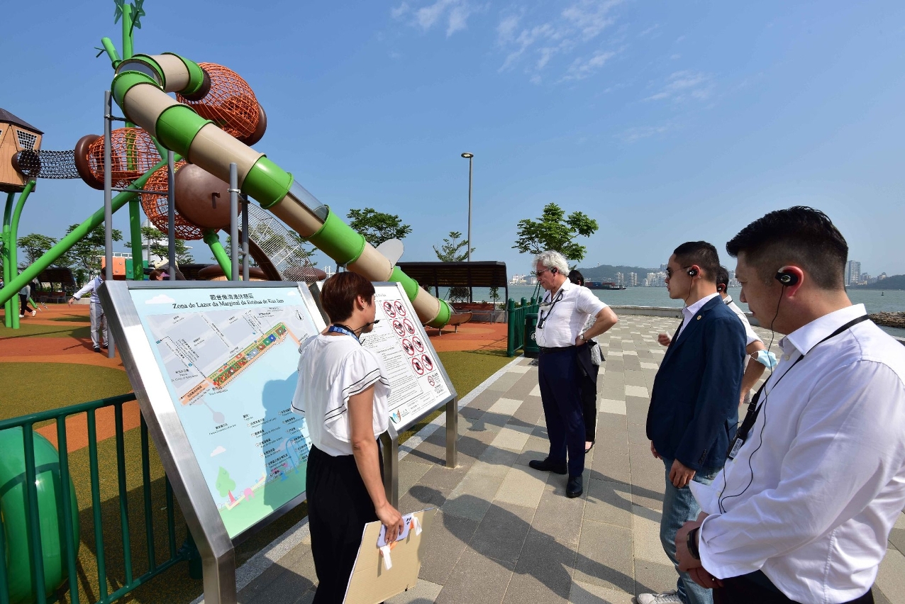 市政管理委員會主席戴祖義、副主席羅志堅,委員關施敏、麥儉明,陪同市政諮詢委員會主席司徒民義及多名委員視察現場設施。觀音像海濱休憩區總面積約一點五萬平方米,當中兒童遊樂區佔約二千七百平方米,引入了新穎的遊樂設施,並劃分不同年齡區域,讓小朋友在玩樂中學習不同技巧及鍛鍊體能,有助身心平衡發展。休憩區內亦設有約四百米的海濱步行徑、多功能球場、門球場、滾軸溜冰場等健身康樂設施,為市民大眾及青少年提供多元的休閒運動選擇。另外,亦設有儲物櫃、自助售賣服務區等,而茶座、親子廁所及哺乳室等友善設施亦將會陸續進場,讓不同年齡層的市民在海濱休憩區玩樂時,有更好的使用感受。
