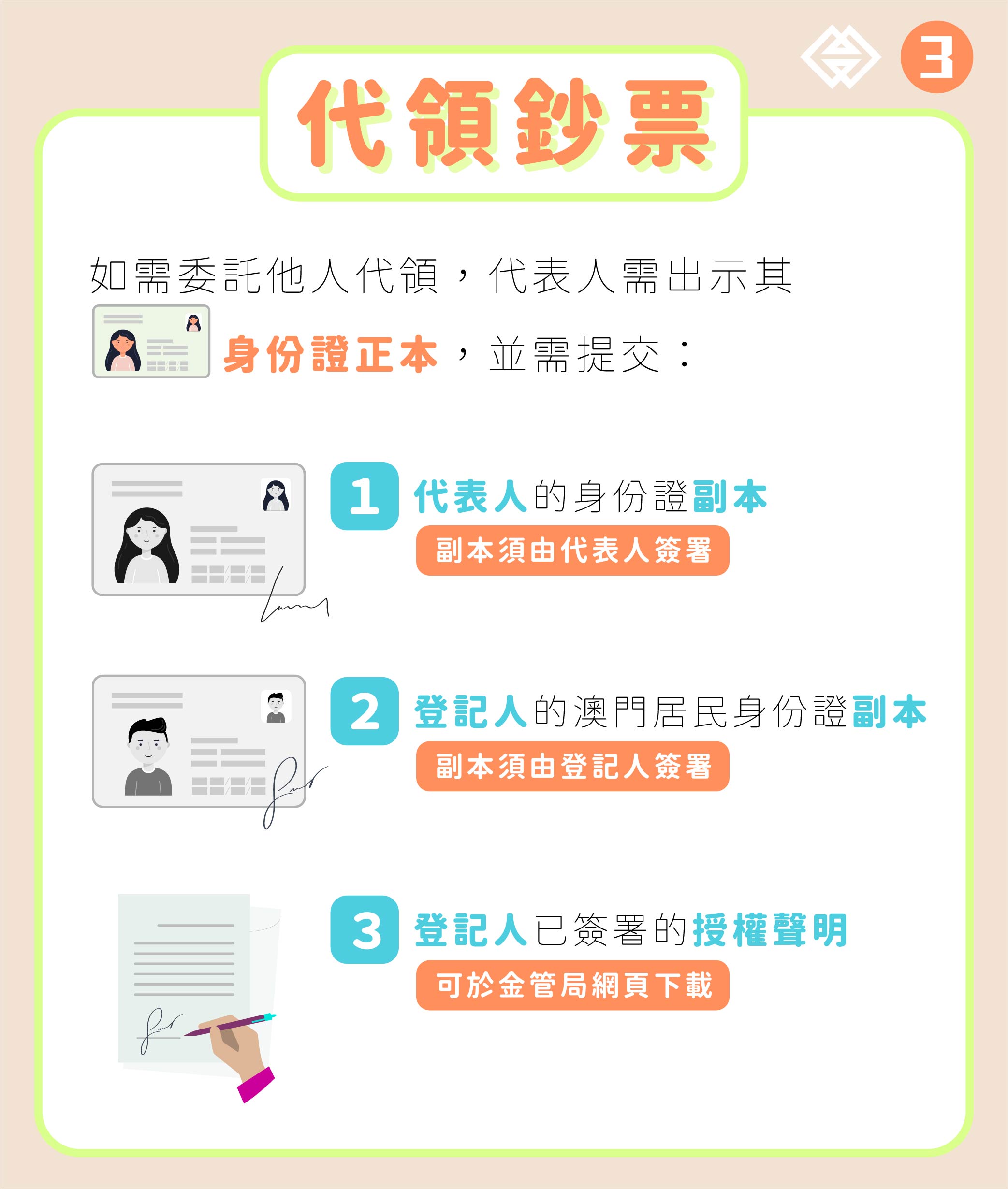 上述鈔票的兌換期由2021年5月4日(星期二)起至2021年7月23日(星期五)止。已登記人士須在登記時所選定日期的辦公時間內,帶同有效澳門居民身份證到選定的銀行網點進行兌換;也可委託代表人於選定的日期及地點進行代領兌換,代表人須帶同本人的身份證明文件正本及提交下列文件: