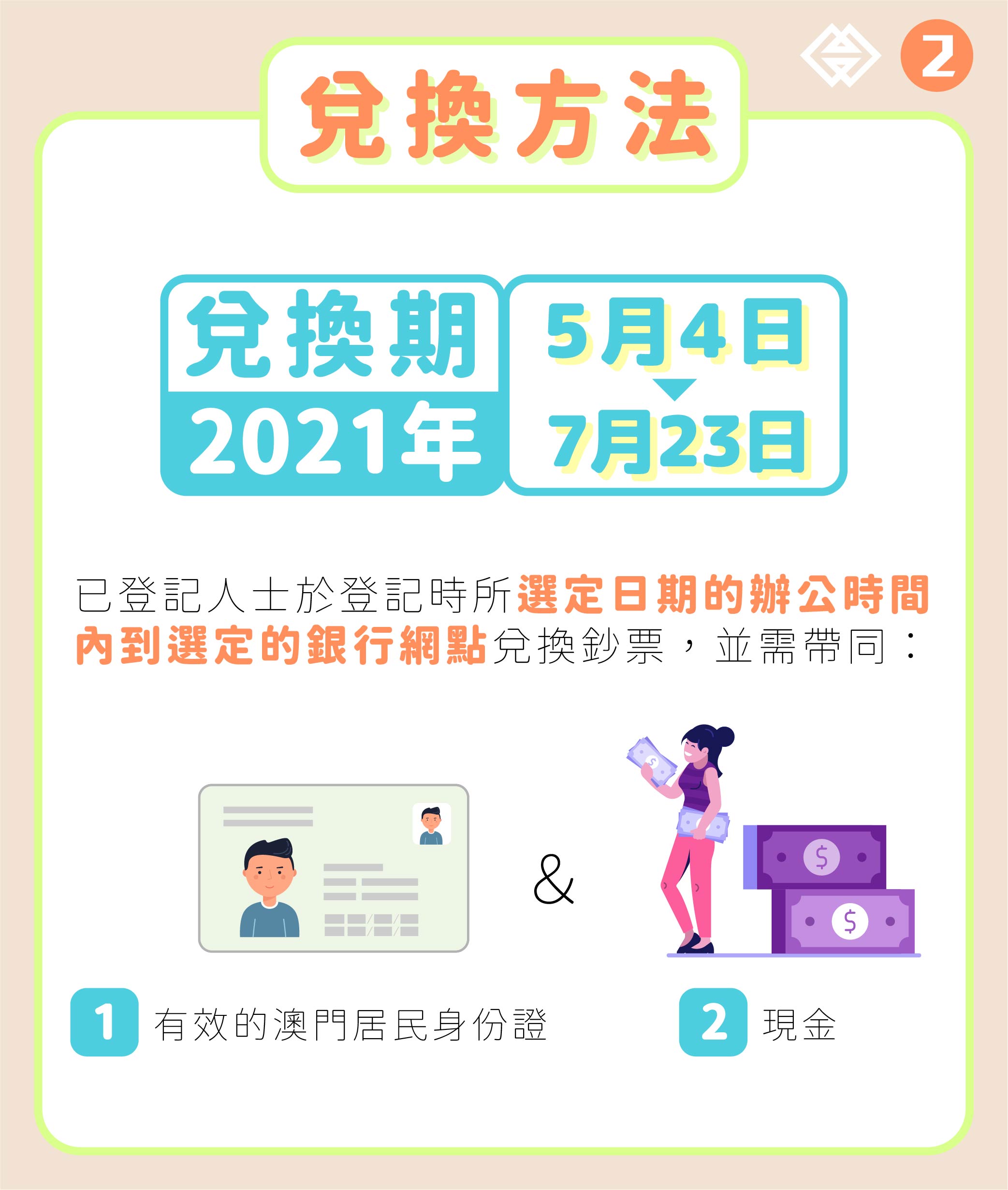 經確認實際登記人數後,每名已登記的澳門居民可兌換每家發鈔銀行發行的庚子鼠年和辛丑牛年生肖鈔各50張、澳門回歸祖國二十週年鈔各5張,即合共可兌換鈔票總數量為210張,兌換所涉及金額為2,200澳門元。