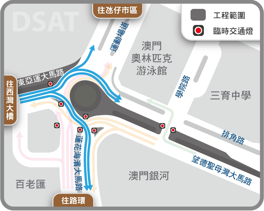 配合建設發展辦公室開展「奧林匹克游泳館圓形地周邊路網重整」工程,圓形地周邊正實施第二階段改道措施,交通事務局經連日觀察及與警方密切溝通,為更好地疏導圓形地周邊各方向之車流,今日(4月30日)下午三時起調整有關臨時交通安排,包括取消東亞運大馬路往市區方向之專道,即該道路之最左車道改由臨時交通燈控制,並允許駛往望德聖母灣大馬路方向,調整後東亞運大馬路往望德聖母灣大馬路之車道會由一條變為二條,其餘行車動線不變,而其他路口則維持現有的臨時交通燈號控制下輪流通車安排。