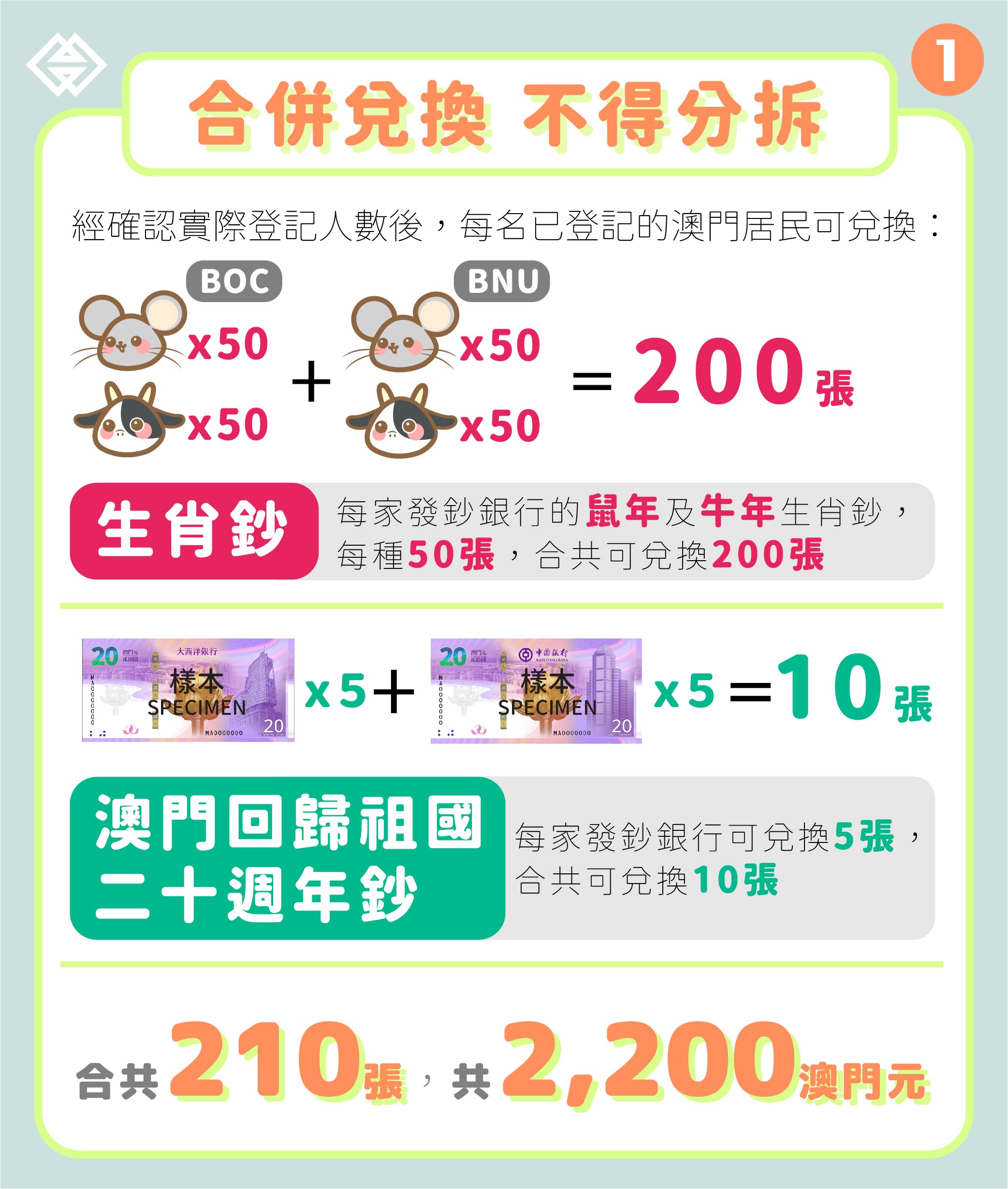 鼠年、牛年生肖鈔,及早前已發行的澳門回歸祖國二十週年鈔,今(4)日起至2021年7月23日提供兌換服務。每名已登記的澳門居民可於登記時所選定的日期,帶同有效澳門居民身份證到選定銀行網點,兌換由每家發鈔銀行發行的庚子鼠年和辛丑牛年生肖鈔各50張,以及澳門回歸祖國二十週年鈔各5張,即合共可兌換上述鈔票總數量為210張,兌換所涉及金額為2,200澳門元。
