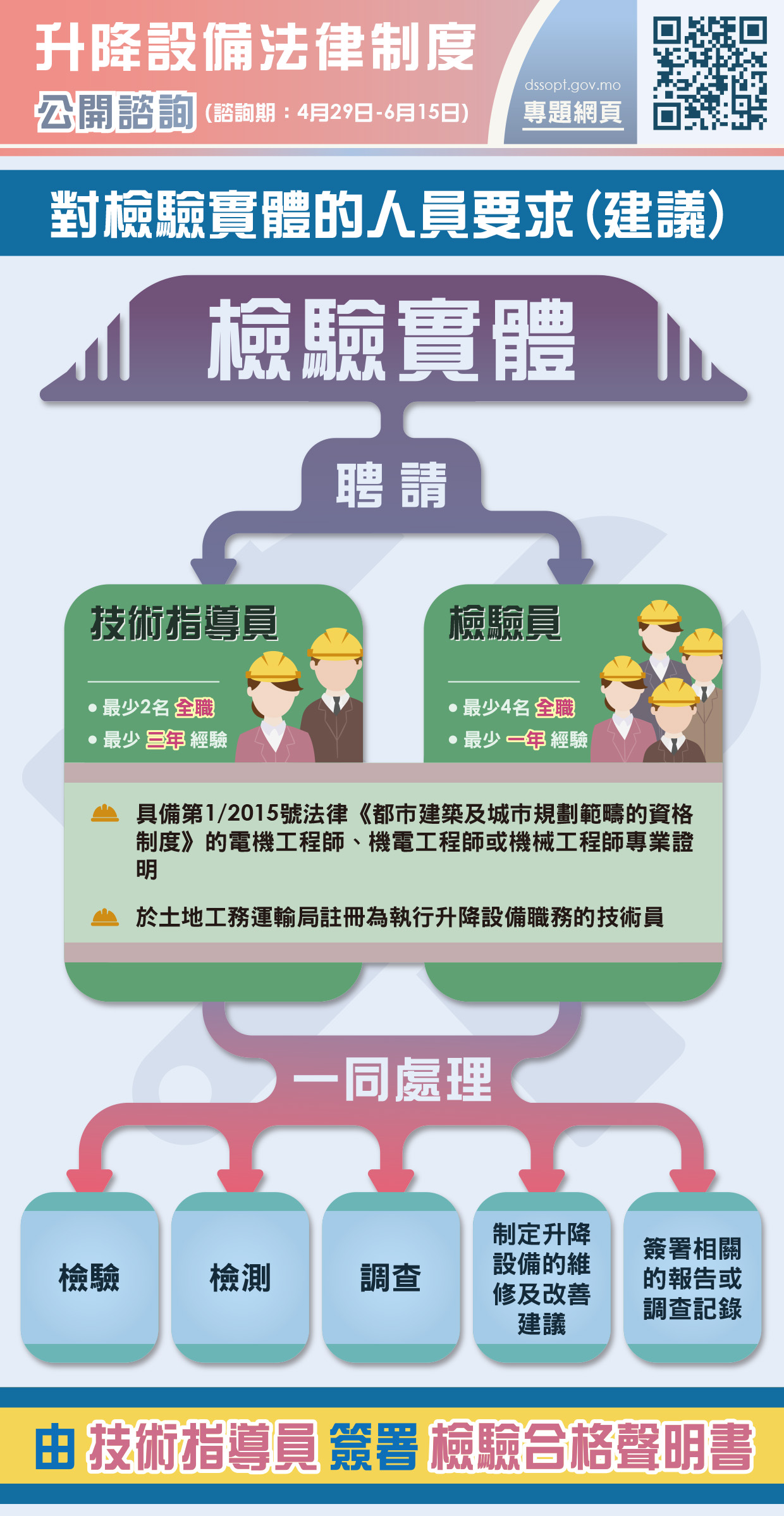諮詢本文建議明確將“維修保養”及“檢驗”作為兩項由不同實體負責的工作,可在管理及監察上達到相互獨立,亦建議規範股東和組成技術人員的編制不能重疊等。為提升行業專業水平,建議對兩個實體的編制作出最低要求,其中,維修保養實體要求最少包括一名全職維修技術員及一名全職保養員的編制;檢驗實體則最少包括兩名全職技術指導員及四名全職檢驗員的編制。從事上述相關業務,除保養員外均須獲得相應專業資格,現時已登記的三類可從事升降設備業務的專業工程師有超過900位,相信可滿足市場需要。此外,由於未有明顯增加現時保養員的工作量,預計法律實施時不會對保養員的人力資源造成影響。