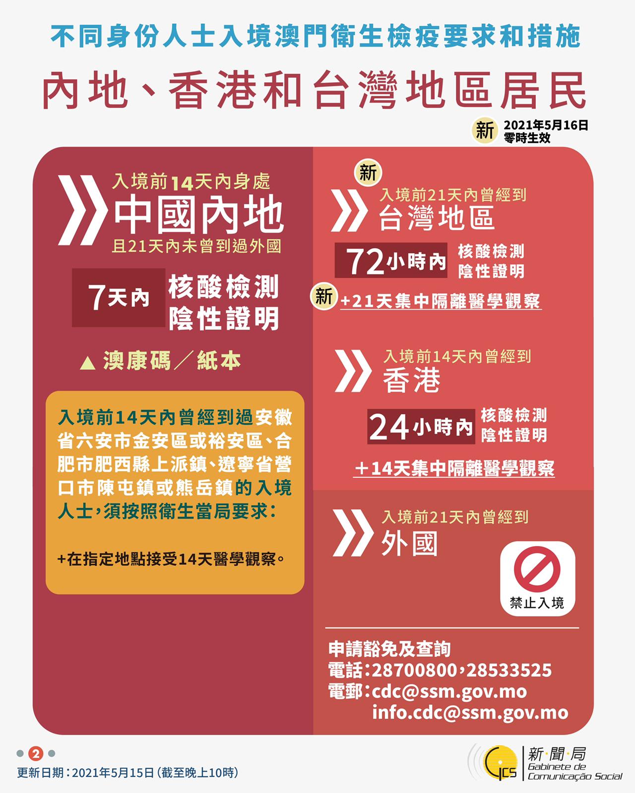 【圖文包】2021/5/16最新入境澳門衛生檢疫要求和措施