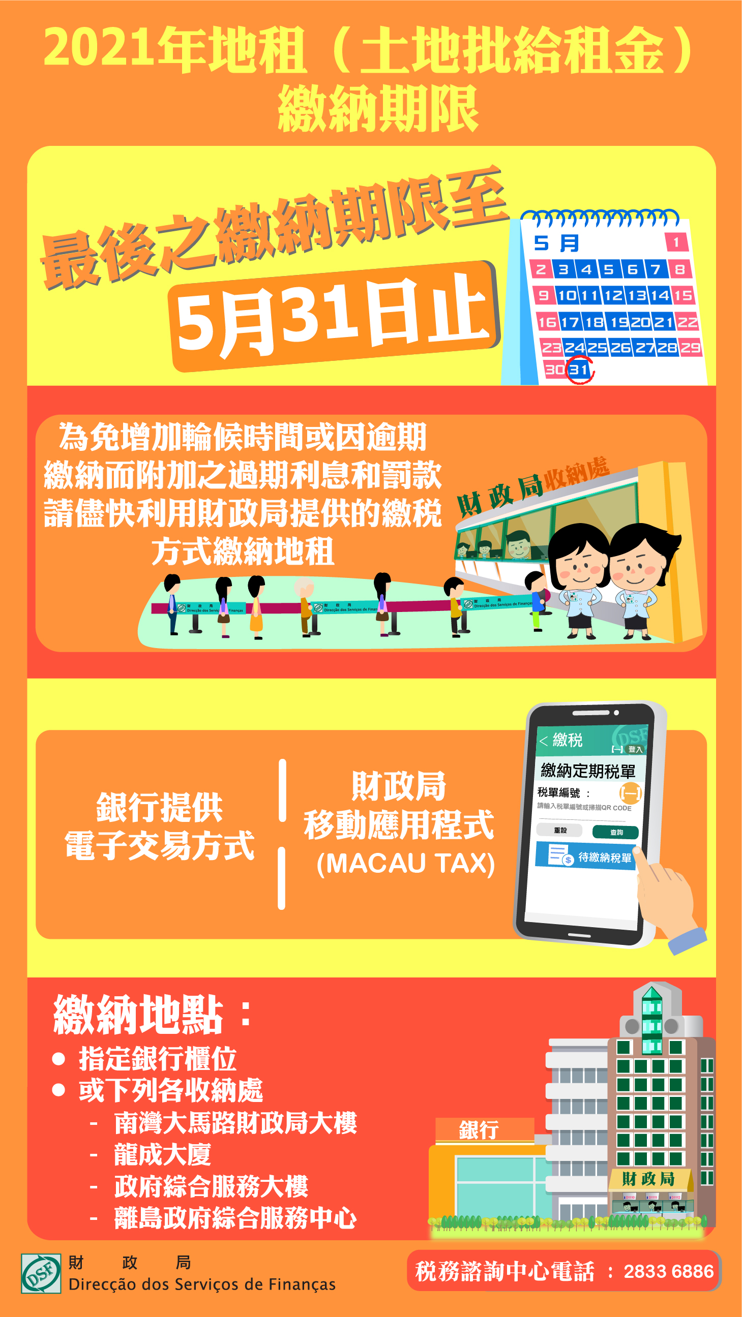 財政局提醒納稅人,2021年地租(土地批給租金)最後之繳納期限至5月31日止,為免增加輪候時間或因逾期繳納而附加之過期利息和罰款,財政局呼籲倘仍未繳納上述地租之納稅人,請儘快利用財政局提供的繳稅方式繳納地租,亦可於辦公時間內,到指定銀行櫃位,以及透過銀行提供電子交易方式,另外,可使用財政局移動應用程式(MACAU TAX)掃瞄徵稅憑單上之二維碼,利用有關移動支付平台繳交稅款,或位於南灣大馬路財政局大樓、龍成大廈、政府綜合服務大樓及離島政府綜合服務中心收納處繳交。