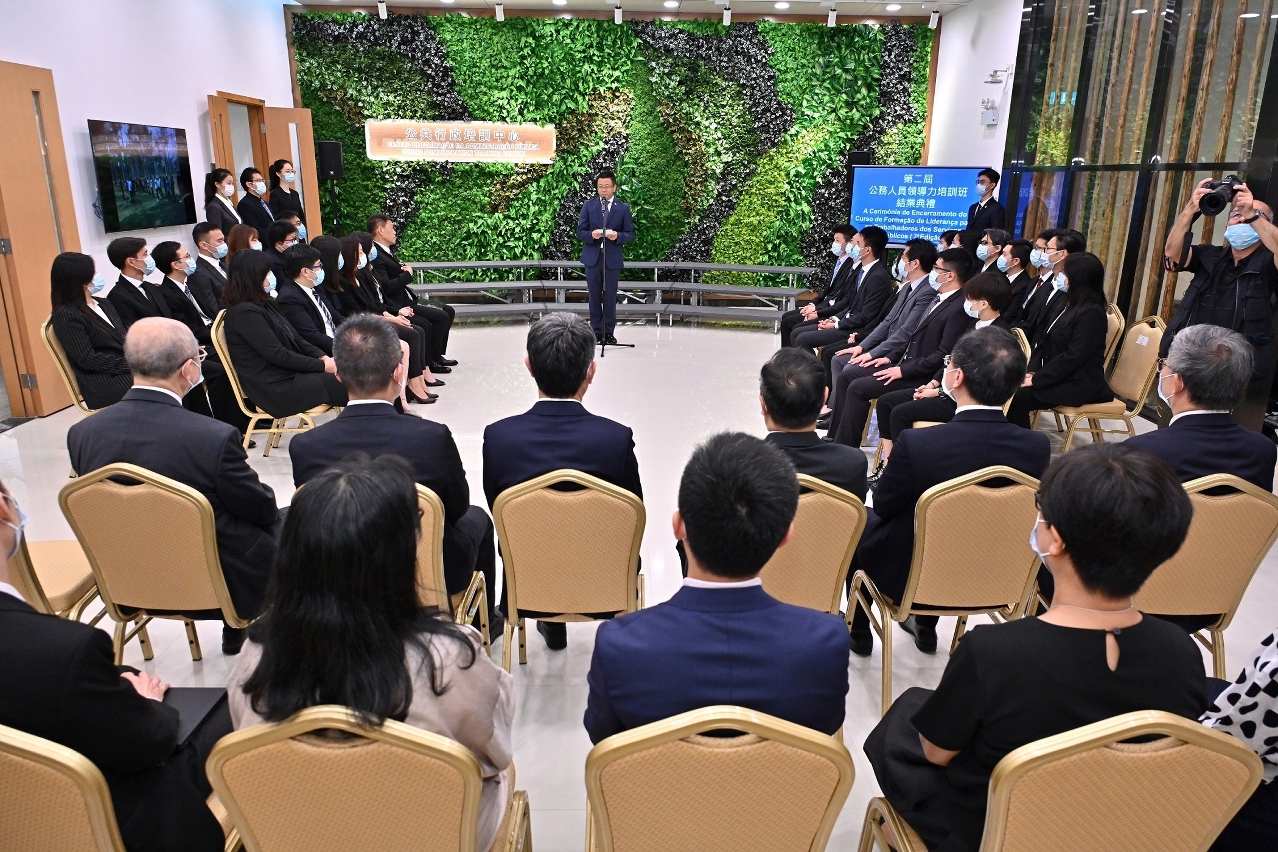 典禮上,宋永華和高炳坤分別向27位學員頒發結業證書。特區政府以“持續開展公務人員系統性培訓工作,提高公務人員特別是年輕公務員專業能力和管理水平,做好領導主管的人才儲備”作為2021年施政重點之一。稅兵於典禮上表示,在特區政府的統一部署下,尤其在行政公職局的大力支持下,公共行政培訓中心舉辦了第二期公務人員領導力培訓課程,並用培訓對象,即高級技術員的起薪點“四、三、零”三個數字總結為期3個月的全脫產培訓工作。“四”意味著4個教學模塊,與首屆領導力培訓課程一樣,涵蓋憲法與基本法、公共行政、國情教育及新知識培訓,但第二屆在課程設計上做了不少調整,包括檢視課程的整體組織,圍繞特區政府施政重點,增加了《現代金融專題研討》、《優化民生建設》、《特區憲政秩序》等新專題,並將《大灣區建設》等課程區分為內地視角、澳門視角等子專題。數字“三”代表辦學思路的3大優化措施,包括強化問題導向,增強學員交流及突出行動導向。數字“零”可以看成一個圓滿的句號,標誌著本期課程的善始善終;同時,培訓中心亦持著歸零心態,重“新”出發,將認真檢討辦學思路、教學安排、行政支持、學員管理的每一個環節,思考未來的優化方向。