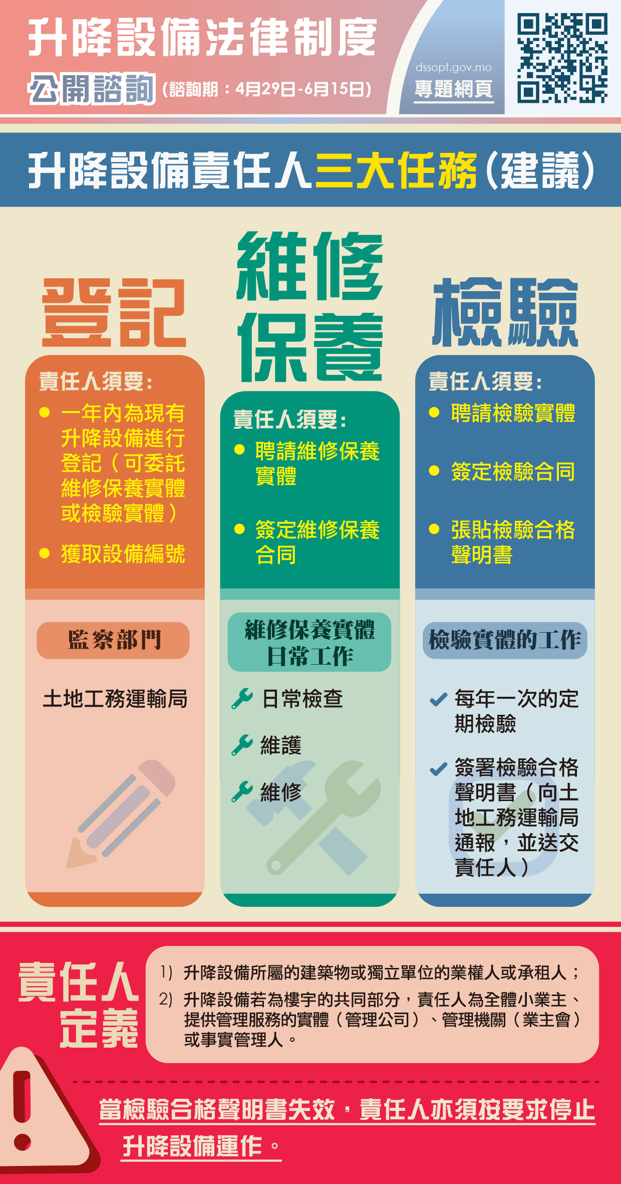 就公眾關注的責任人的權責方面,建議責任人(如全體小業主、管理公司、業主會或事實管理人等)須履行三項工作,包括:一年內為現有升降設備進行登記(可委託維修保養實體或檢驗實體);聘請維修保養實體;聘請檢驗實體。同時,當檢驗合格聲明書失效,責任人亦須按要求停止升降設備運作。