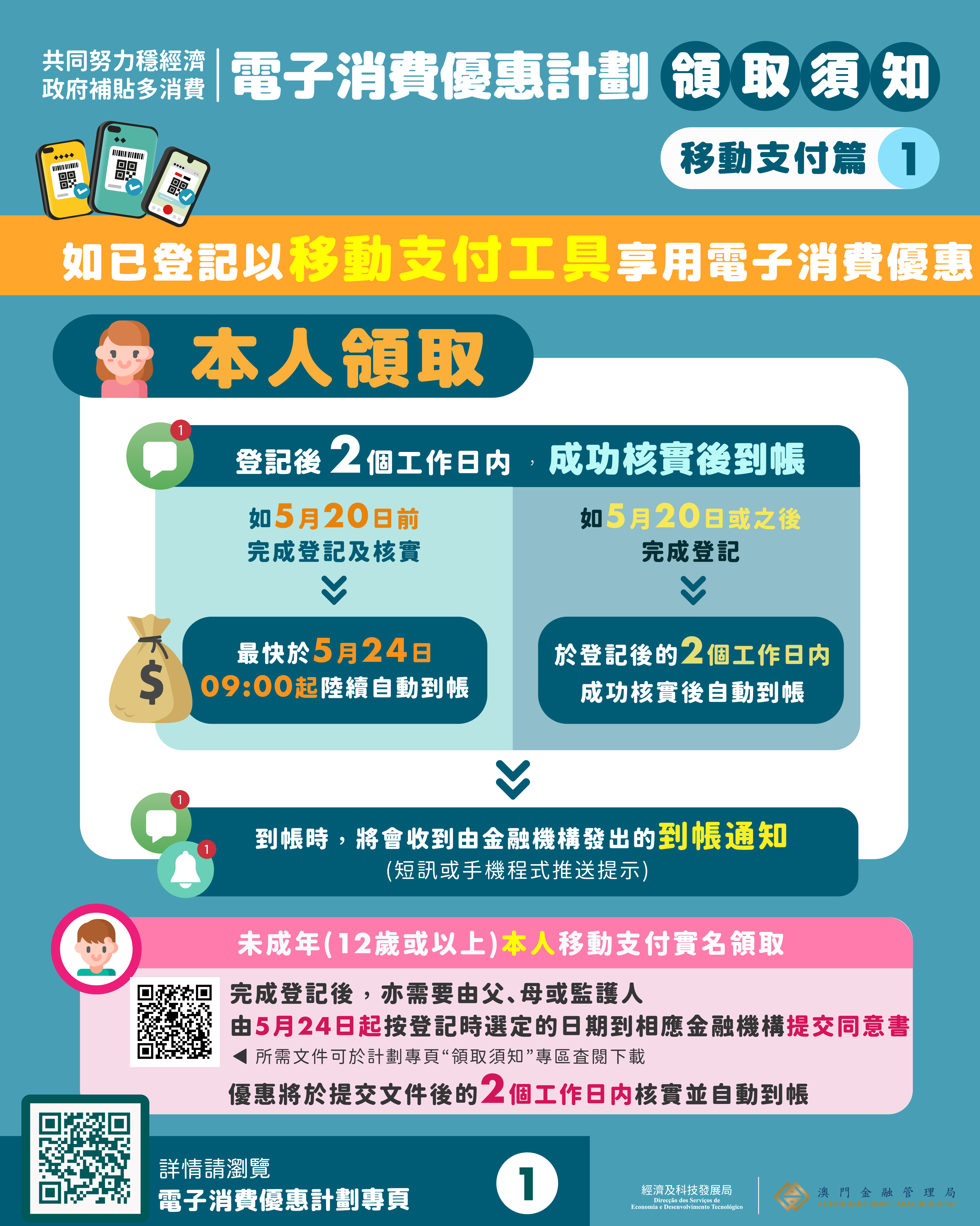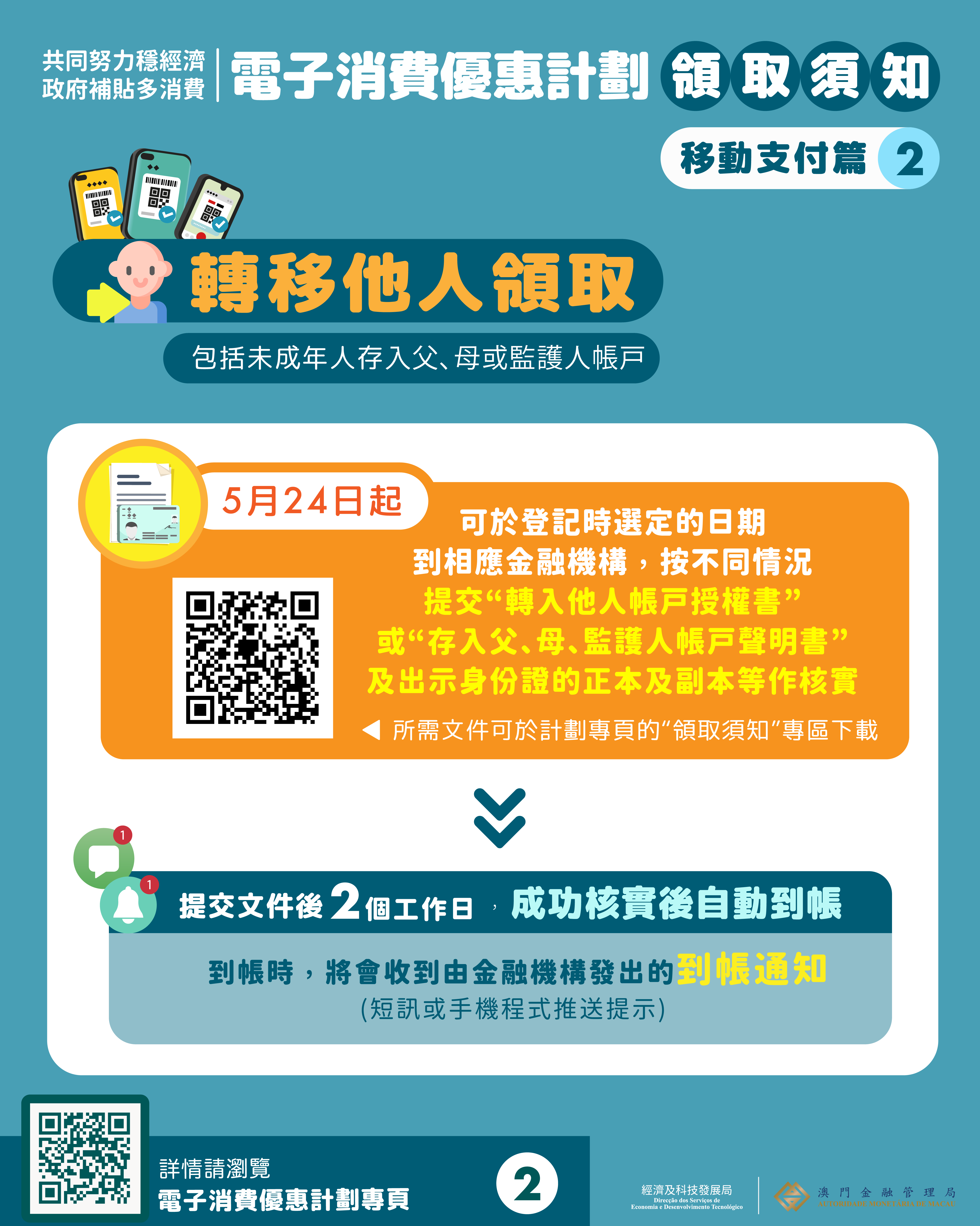 - 如屬優惠轉移的情況,包括將未成年子女的優惠轉移到父、母或監護人的移動支付帳戶的情況,則需自明(24)日起按登記時選定的日期及地點,到有關金融機構提交授權書及出示身份證,以作核實。